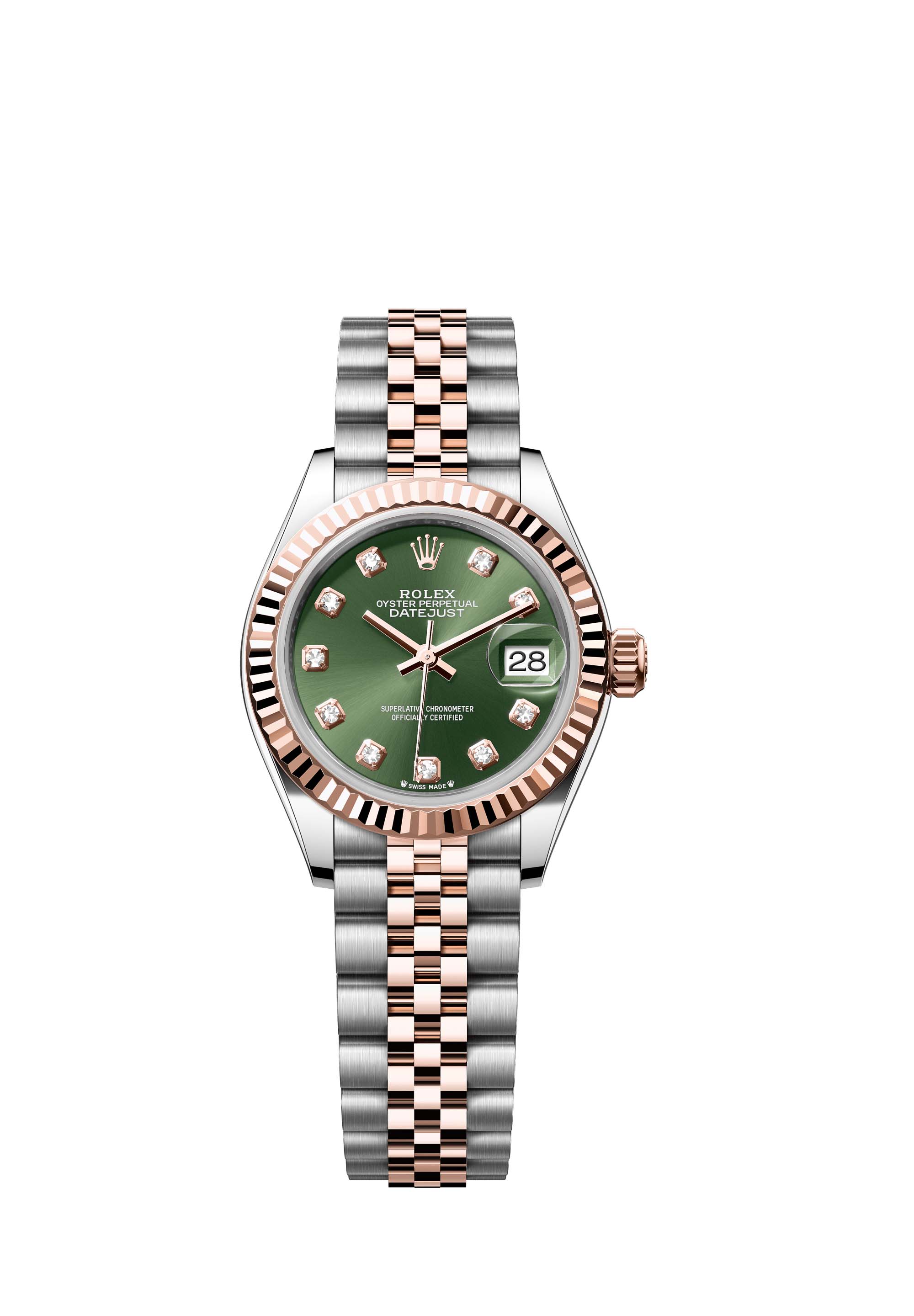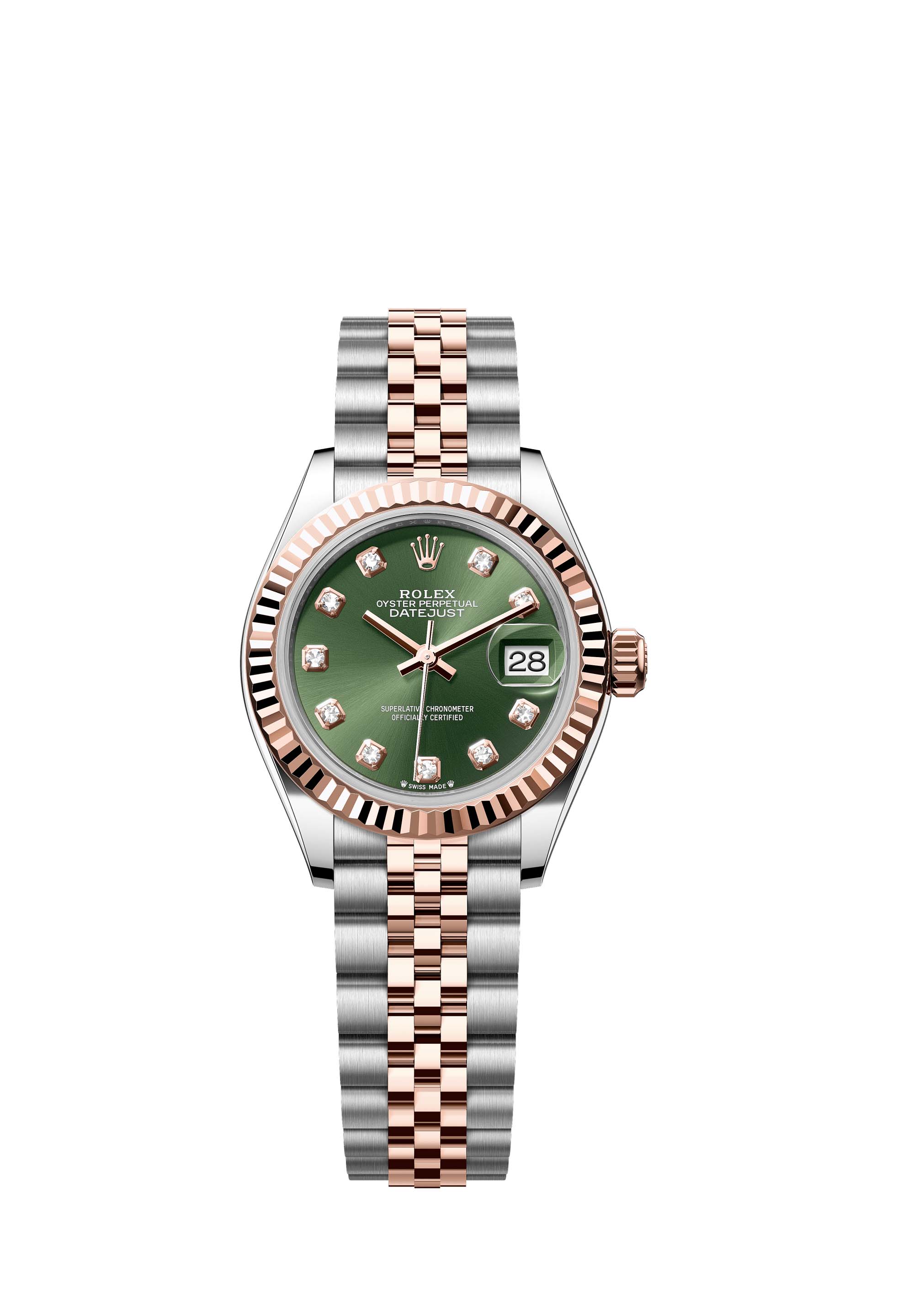 This Oyster Perpetual Lady-Datejust in Oystersteel and Everose gold features an olive-green, diamond-set dial and a Jubilee bracelet.