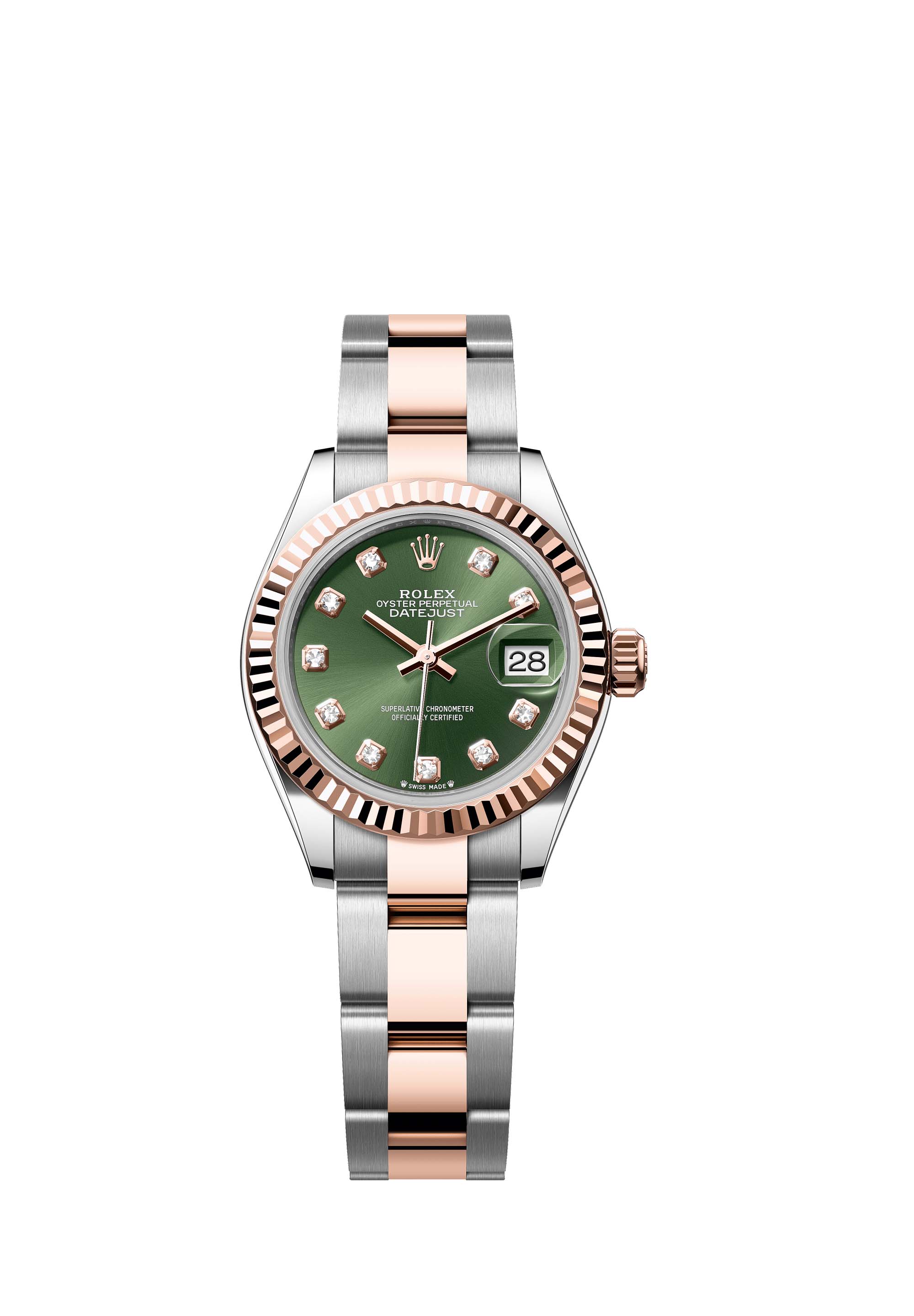 This Oyster Perpetual Lady-Datejust in Oystersteel and Everose gold features an olive-green, diamond-set dial and an Oyster bracelet.