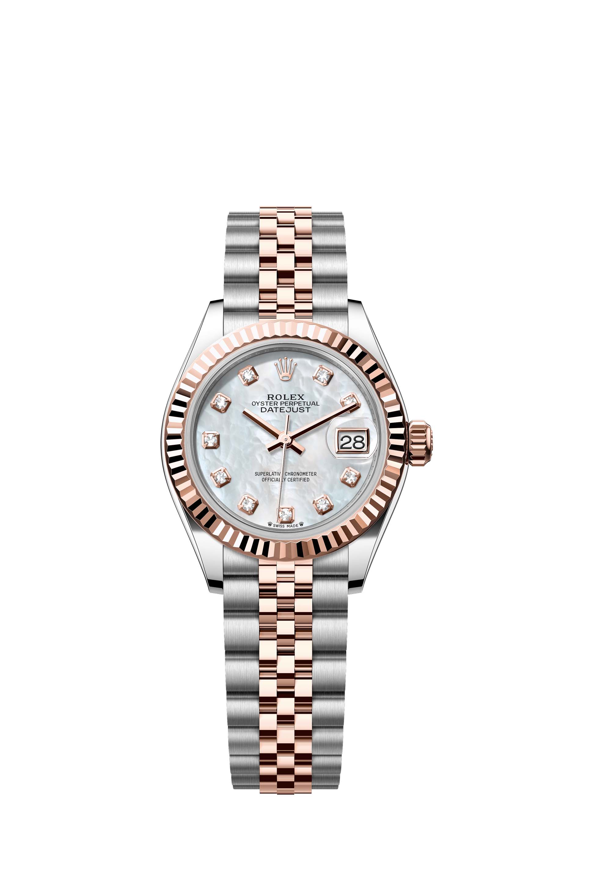 This Oyster Perpetual Lady-Datejust in Oystersteel and Everose gold features a white mother-of-pearl, diamond-set dial and a Jubilee bracelet.