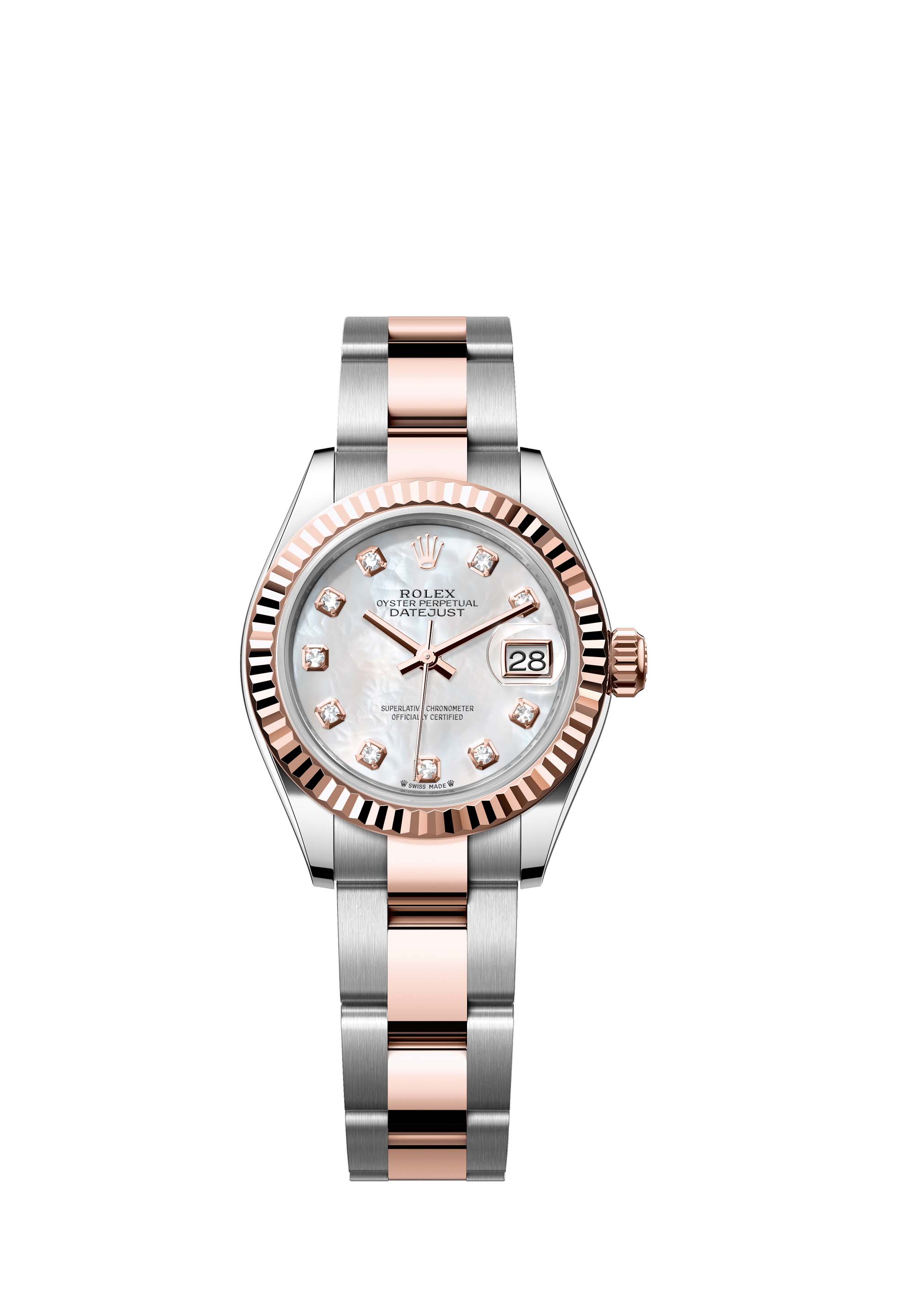 This Oyster Perpetual Lady-Datejust in Oystersteel and Everose gold features a white mother-of-pearl, diamond-set dial and an Oyster bracelet.