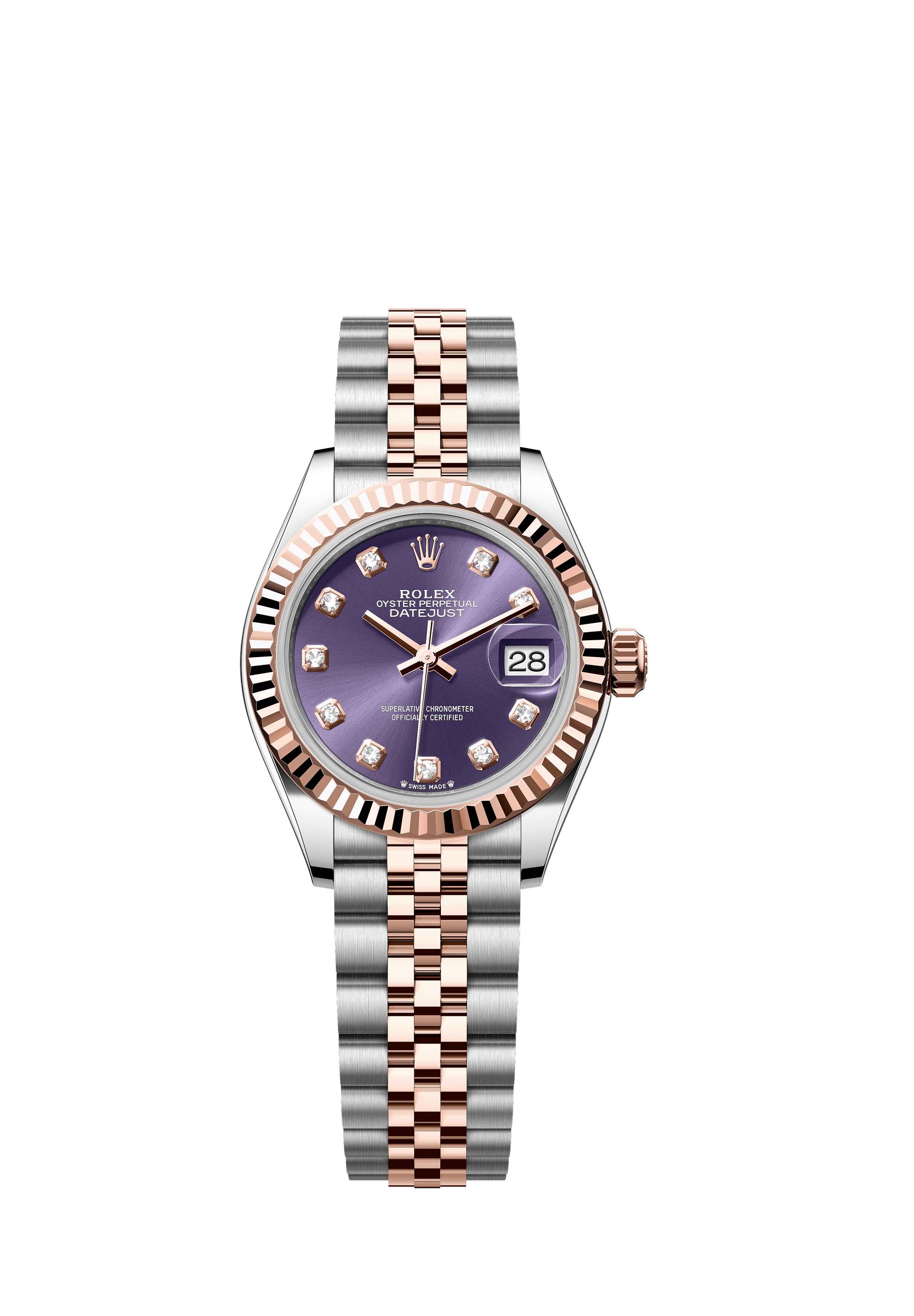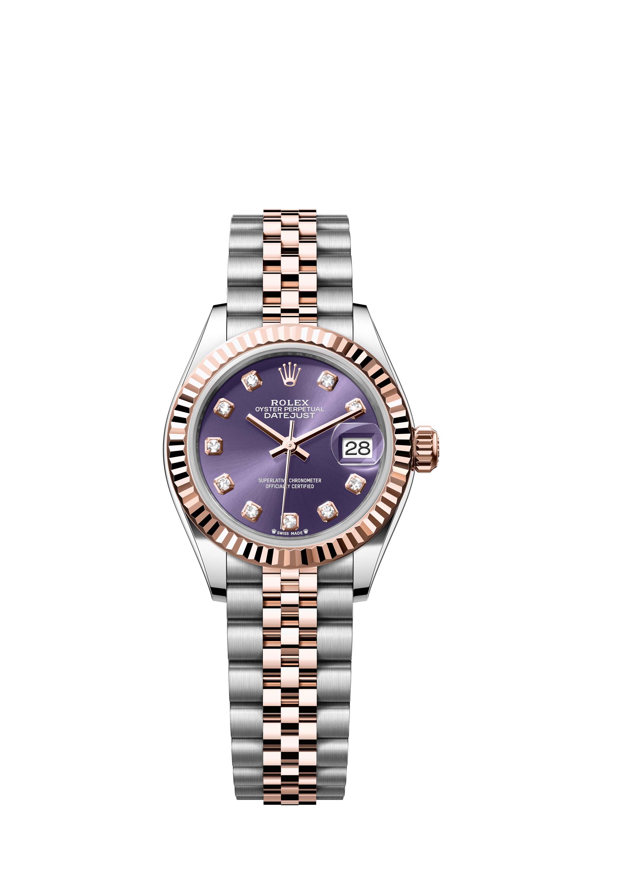 This Oyster Perpetual Lady-Datejust in Oystersteel and Everose gold features an aubergine, diamond-set dial and a Jubilee bracelet.