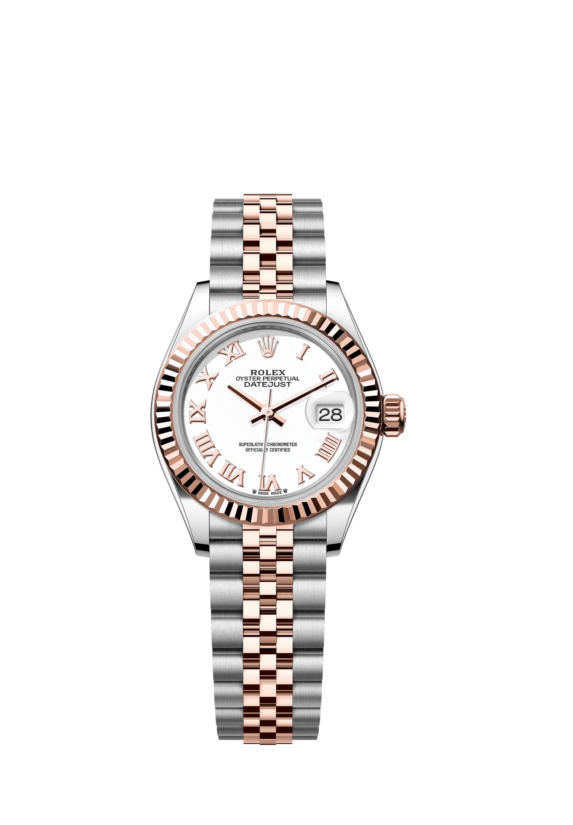 This Oyster Perpetual Lady-Datejust in Oystersteel and Everose gold features a white dial and a Jubilee bracelet.