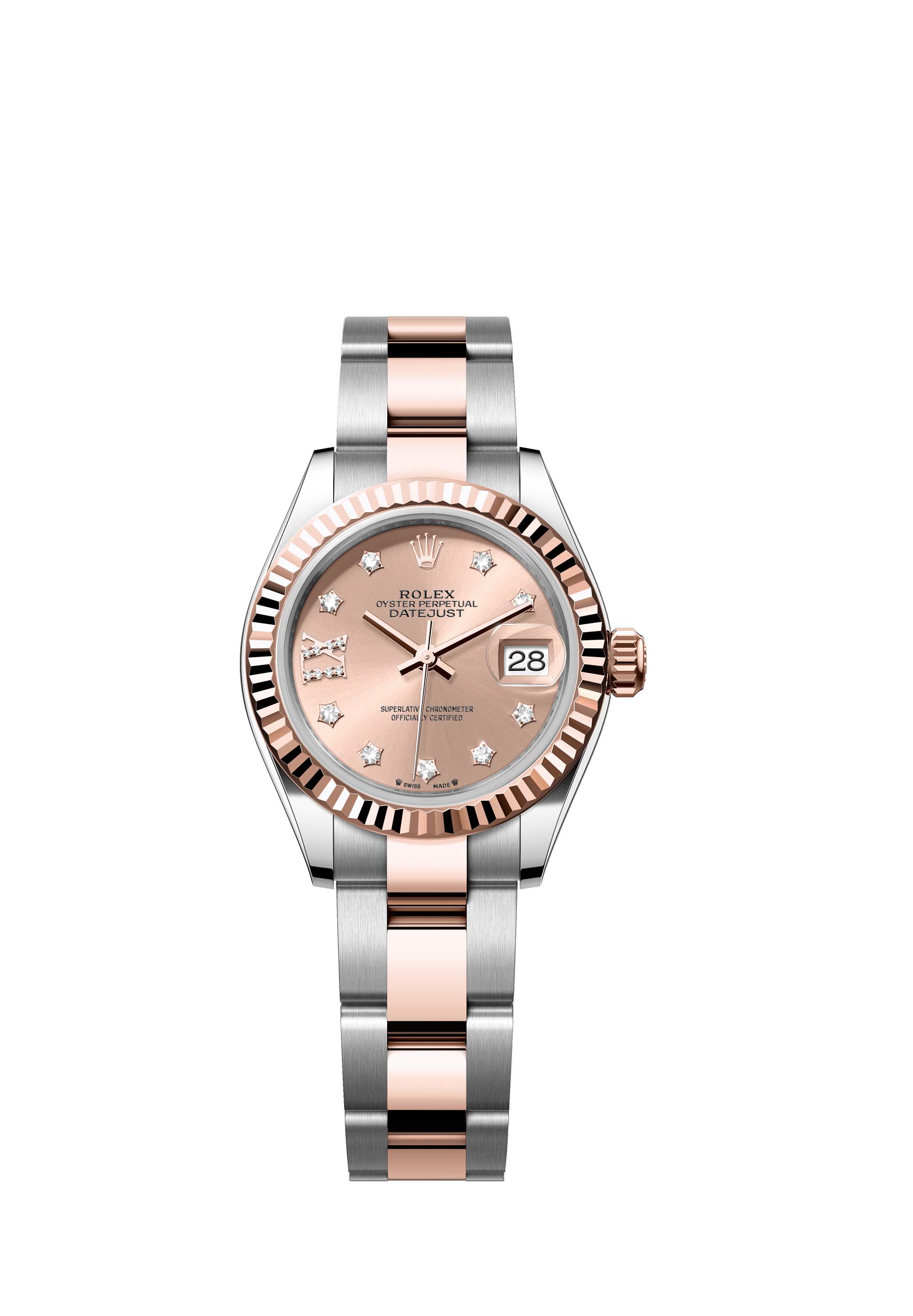 This Oyster Perpetual Lady-Datejust in Oystersteel and Everose gold features a rosé colour, diamond-set dial and an Oyster bracelet.