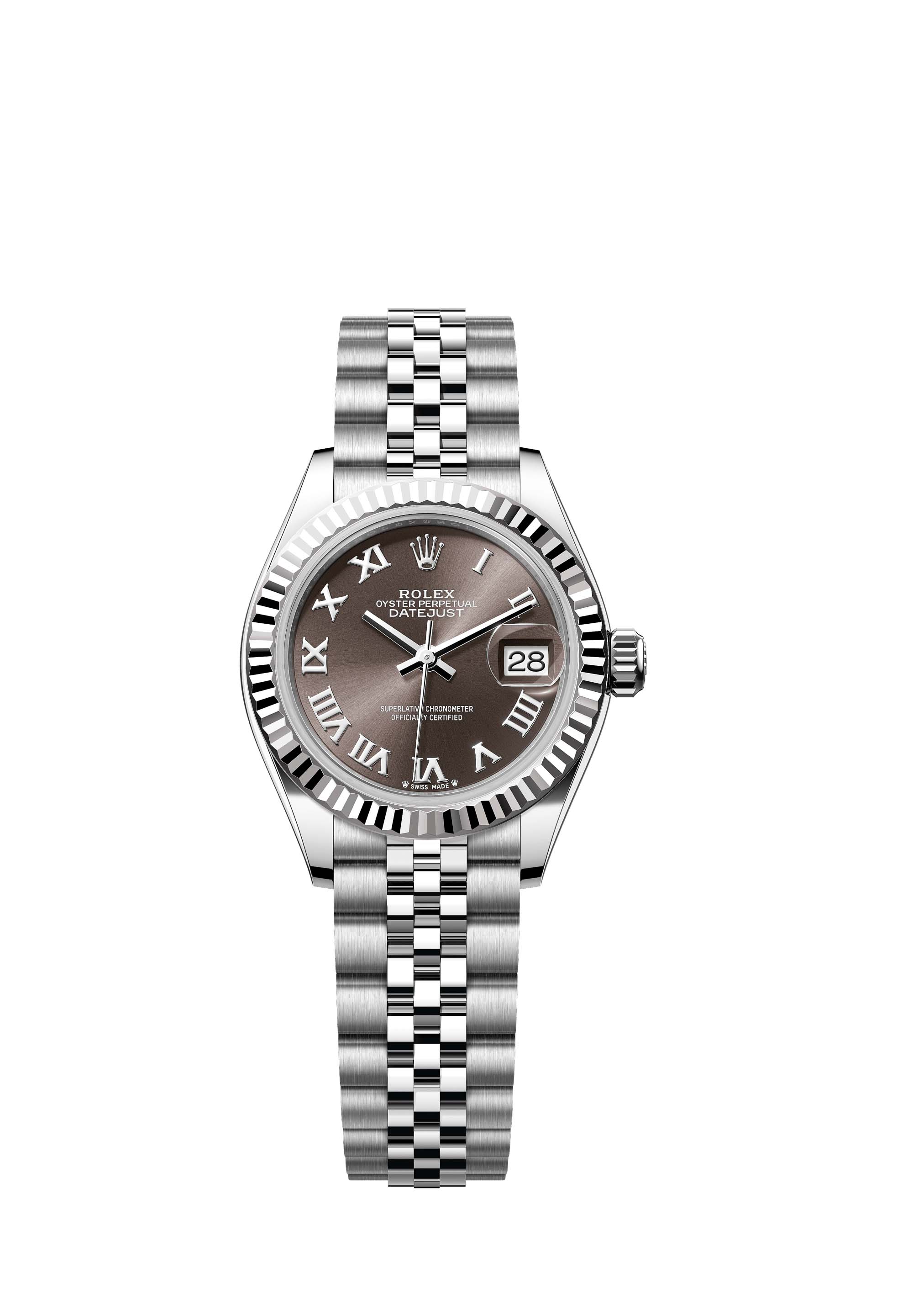 This Oyster Perpetual Lady-Datejust in Oystersteel and white gold features a dark grey dial and a Jubilee bracelet.