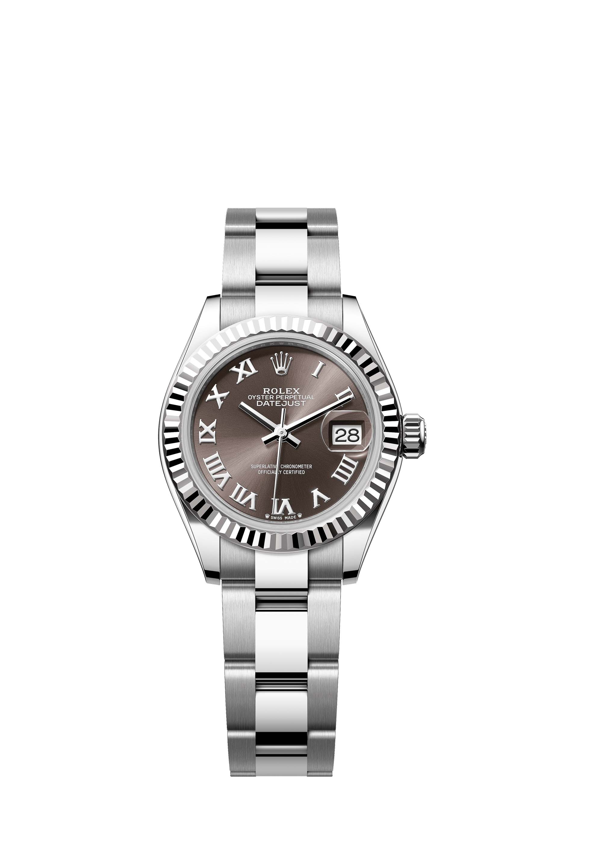 This Oyster Perpetual Lady-Datejust in Oystersteel and white gold features a dark grey dial and an Oyster bracelet.