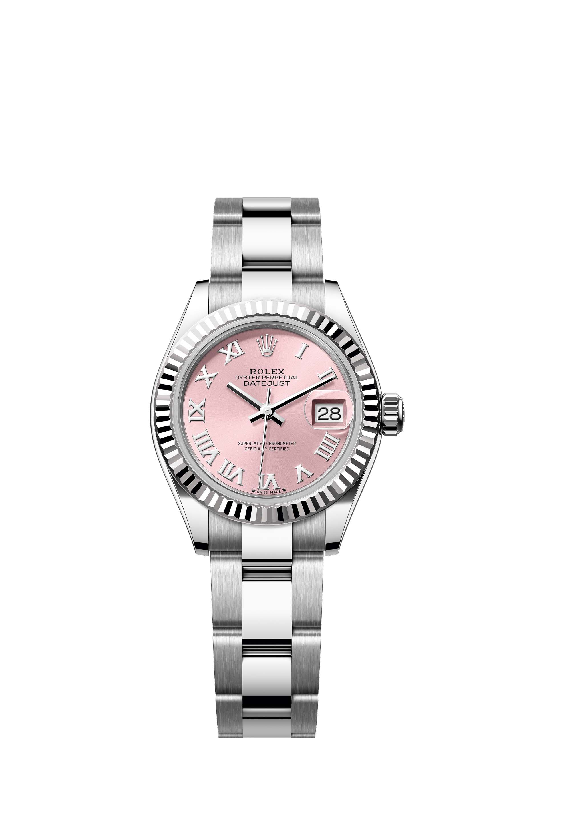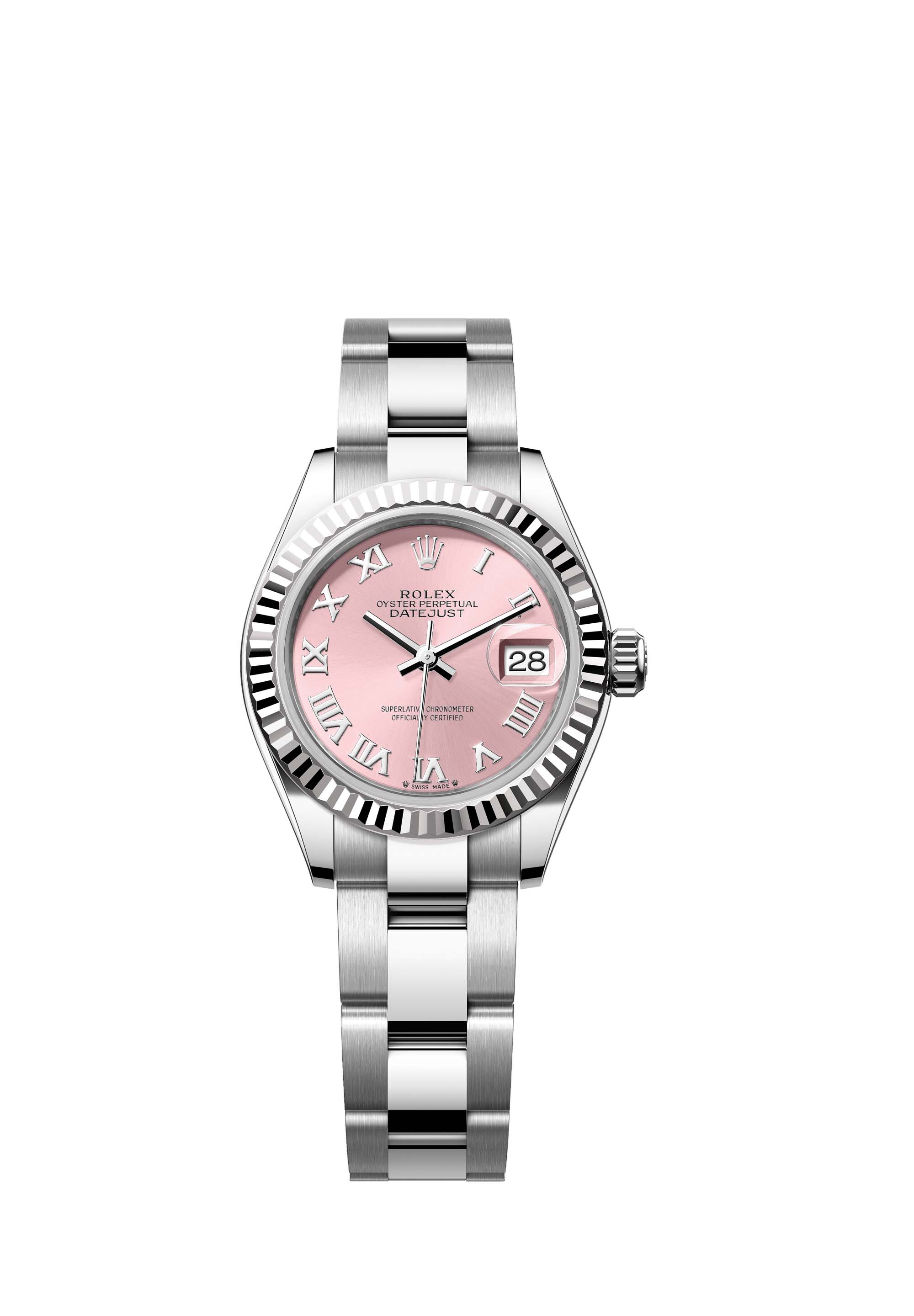 This Oyster Perpetual Lady-Datejust in Oystersteel and white gold features a pink dial and an Oyster bracelet.