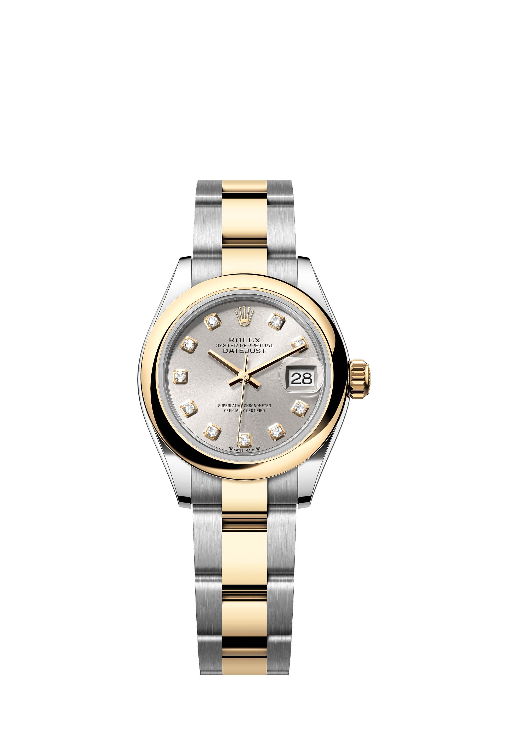 This Oyster Perpetual Lady-Datejust in Oystersteel and yellow gold features a silver, diamond-set dial and an Oyster bracelet.