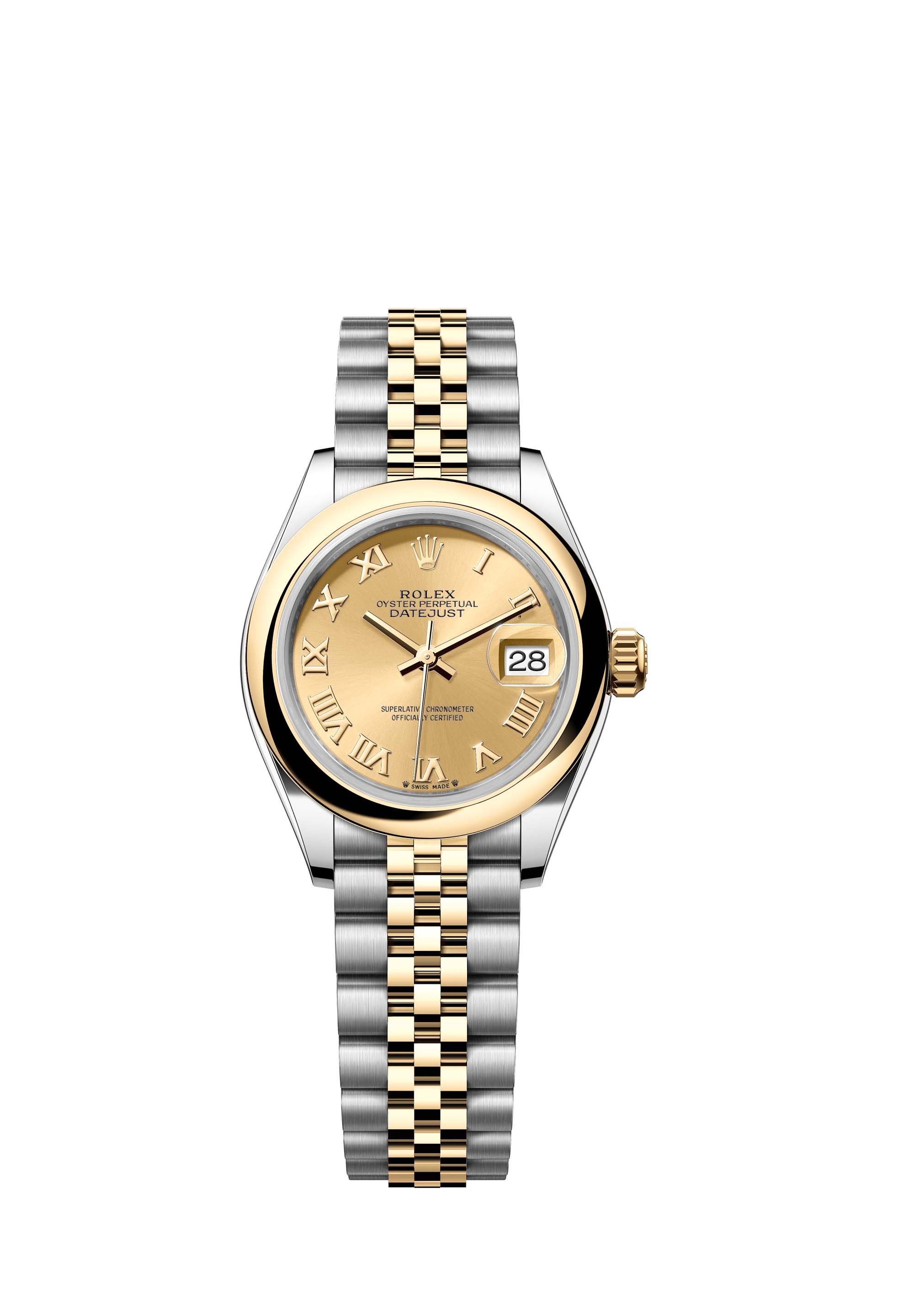 This Oyster Perpetual Lady-Datejust in Oystersteel and yellow gold features a champagne-colour dial and a Jubilee bracelet.
