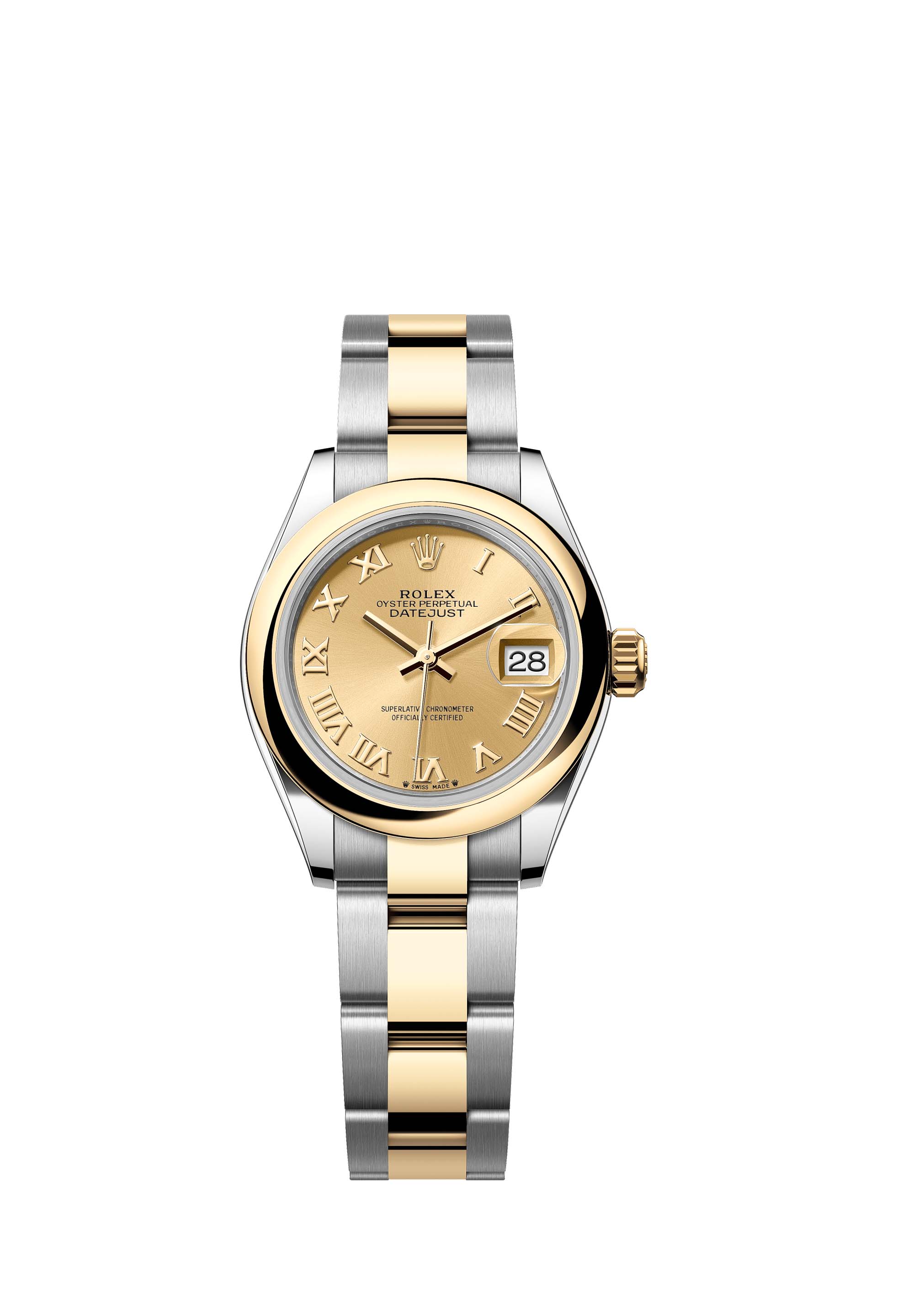 This Oyster Perpetual Lady-Datejust in Oystersteel and yellow gold features a champagne-colour dial and an Oyster bracelet.