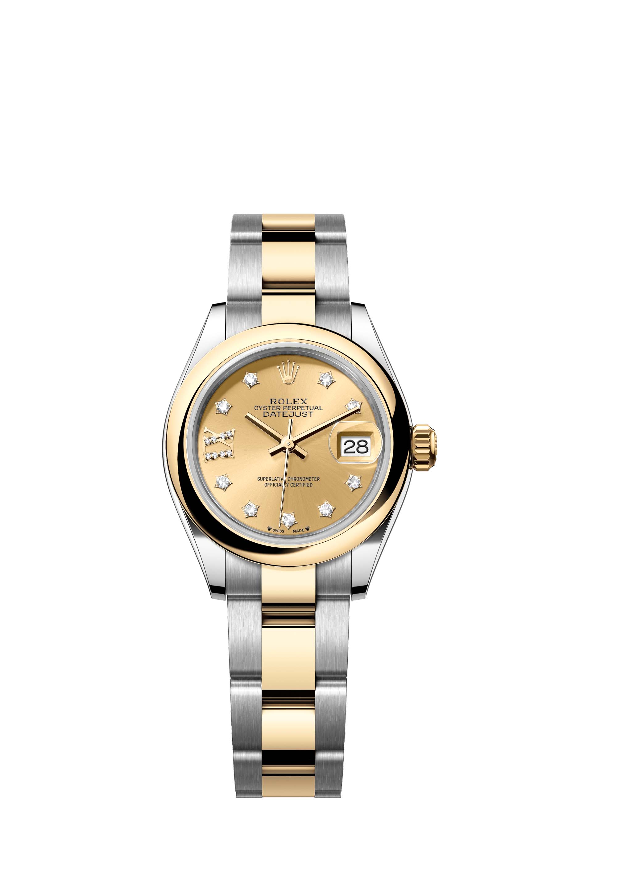 This Oyster Perpetual Lady-Datejust in Oystersteel and yellow gold features a champagne colour, diamond-set dial and an Oyster bracelet.