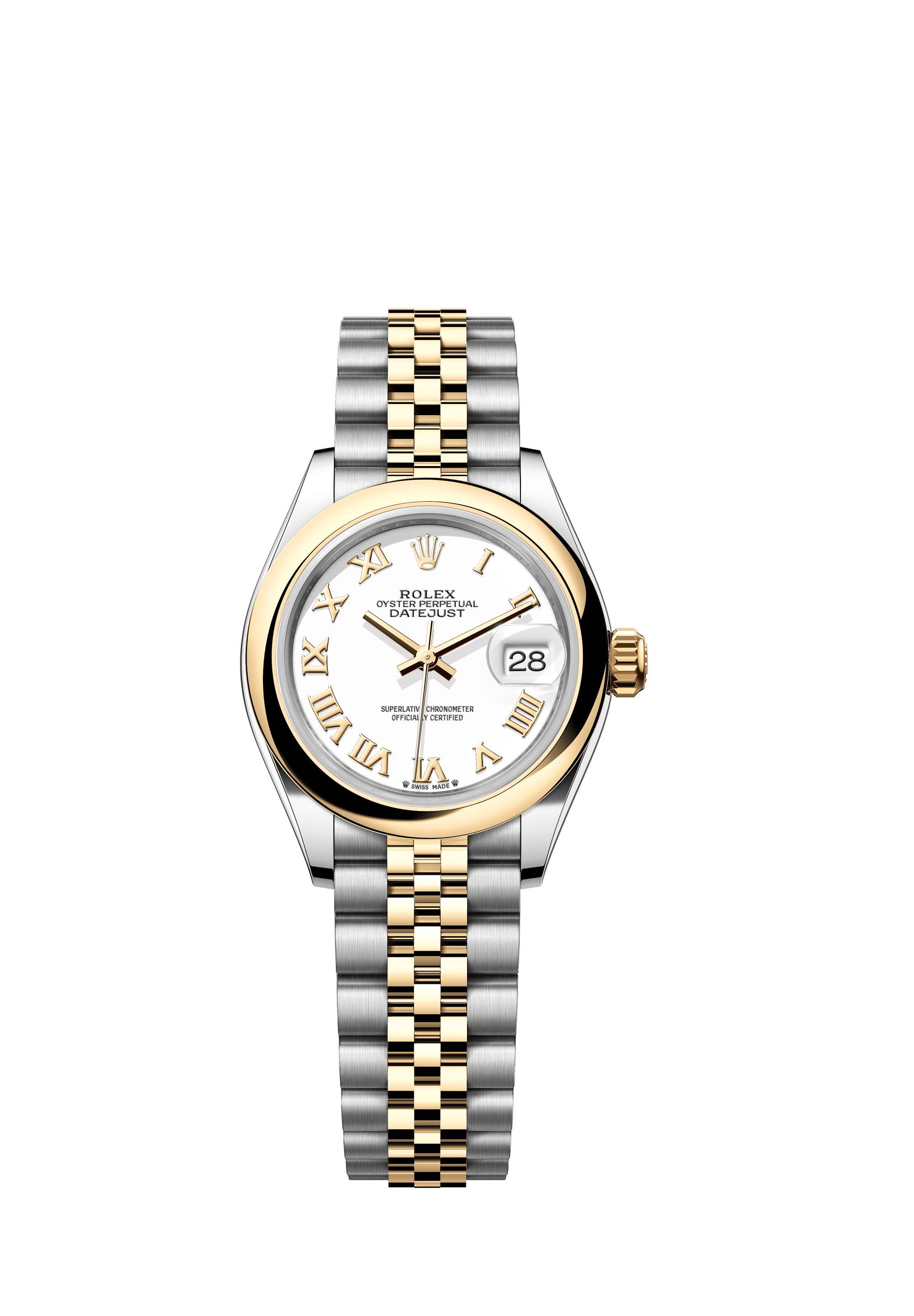 This Oyster Perpetual Lady-Datejust in Oystersteel and yellow gold features a white dial and a Jubilee bracelet.