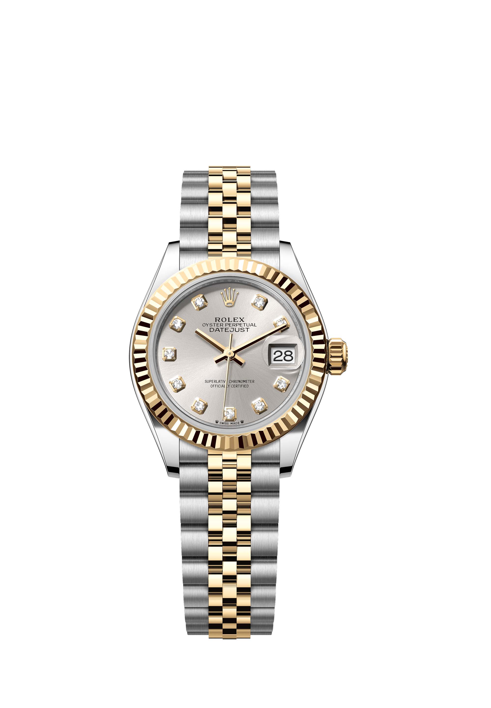 This Oyster Perpetual Lady-Datejust in Oystersteel and yellow gold features a silver, diamond-set dial and a Jubilee bracelet.