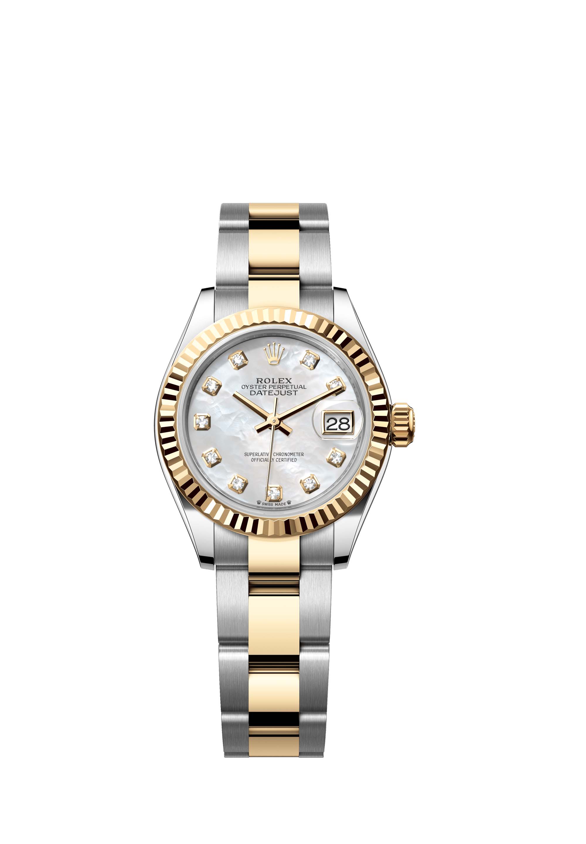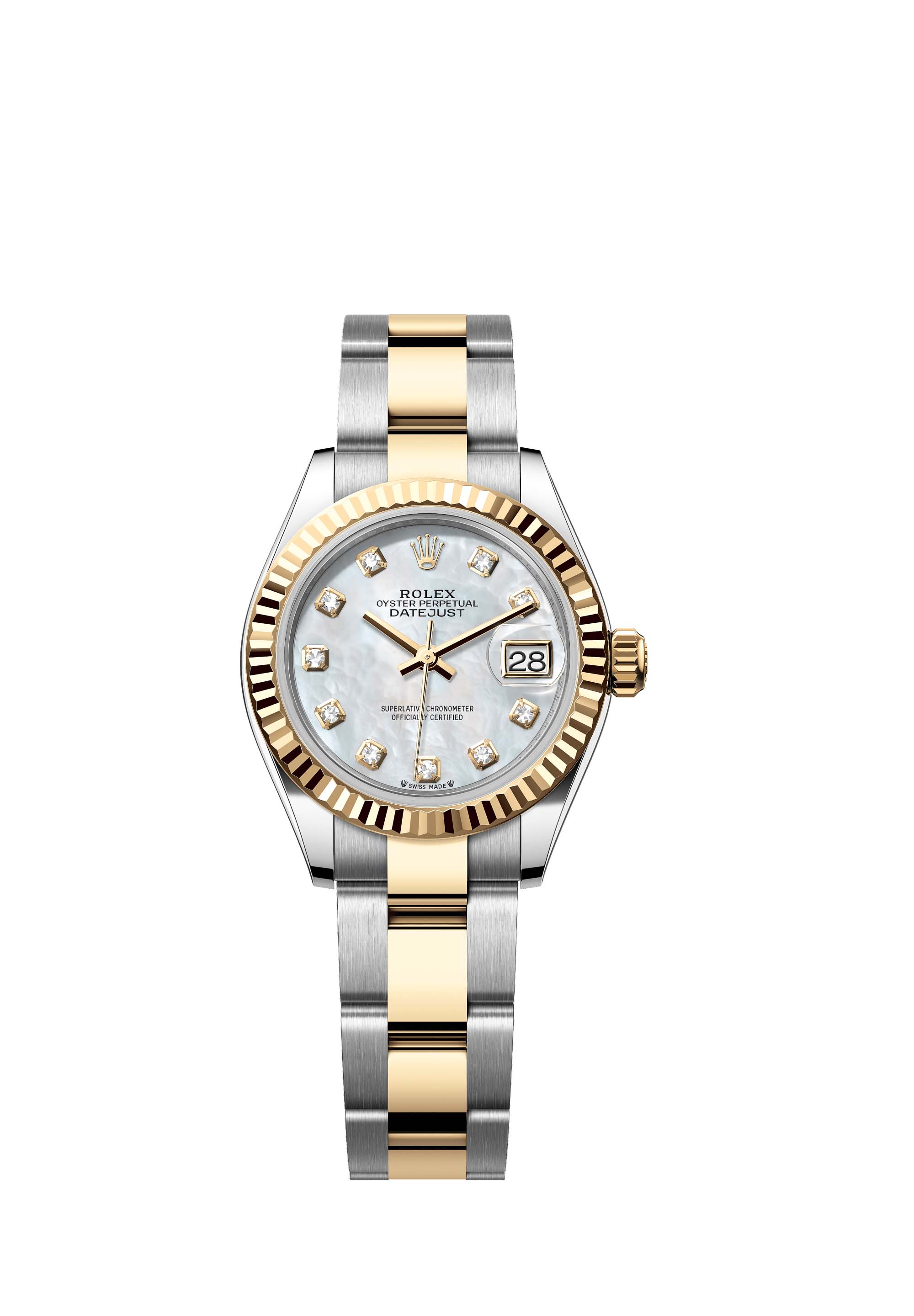 This Oyster Perpetual Lady-Datejust in Oystersteel and yellow gold features a white mother-of-pearl, diamond-set dial and an Oyster bracelet.