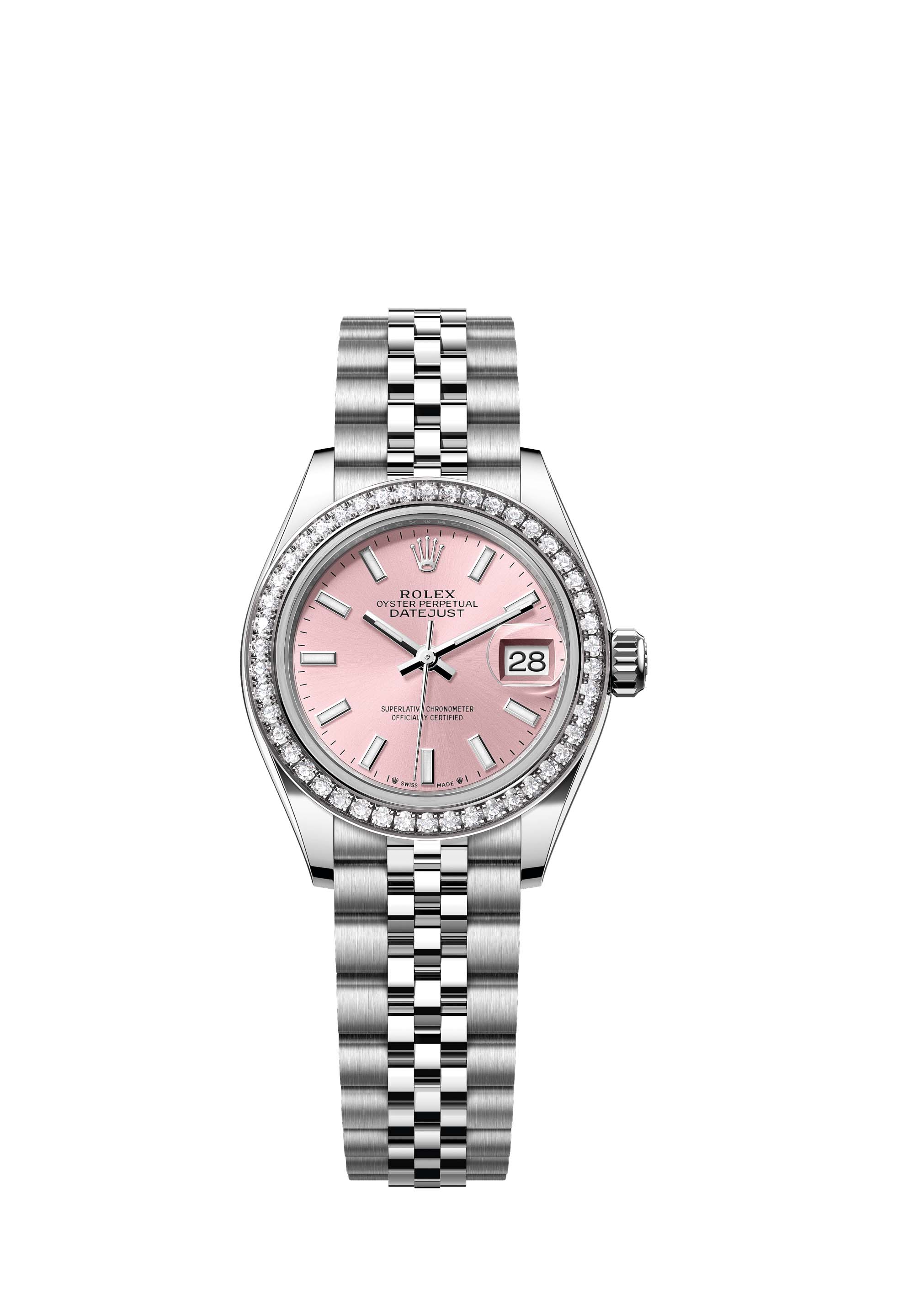 This Oyster Perpetual Lady-Datejust in Oystersteel and white gold features a pink dial and a Jubilee bracelet.