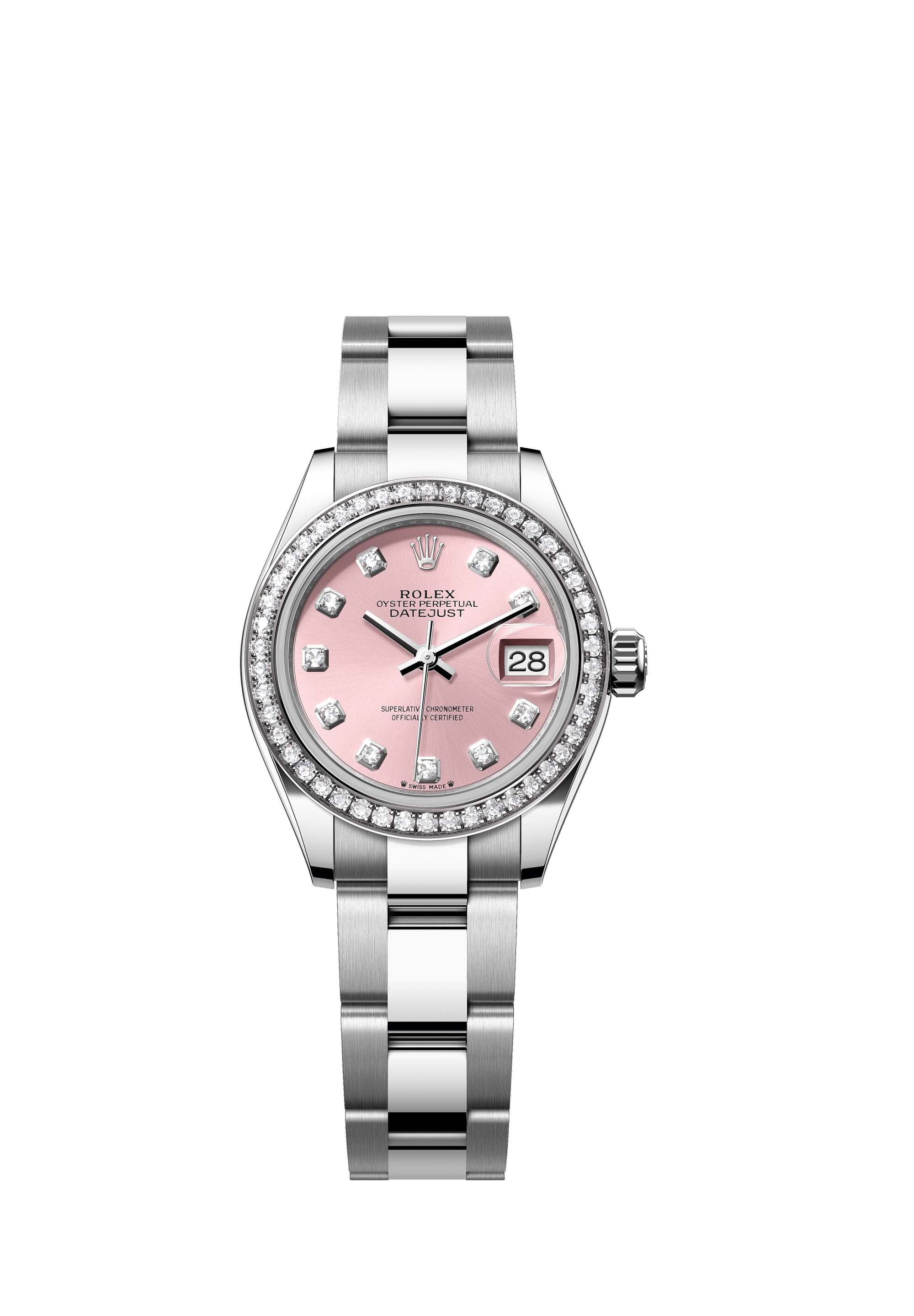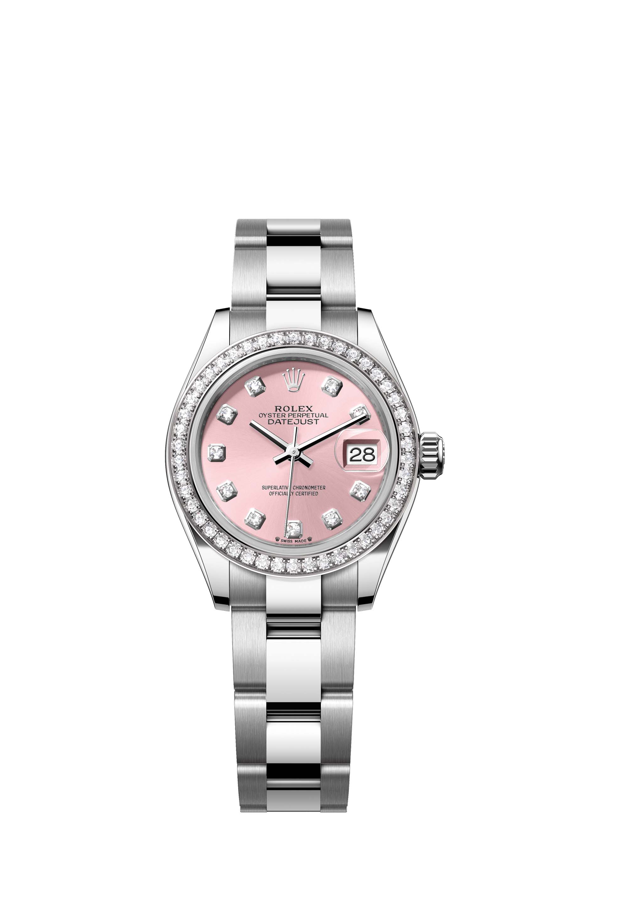 This Oyster Perpetual Lady-Datejust in Oystersteel and white gold features a pink, diamond-set dial and an Oyster bracelet.