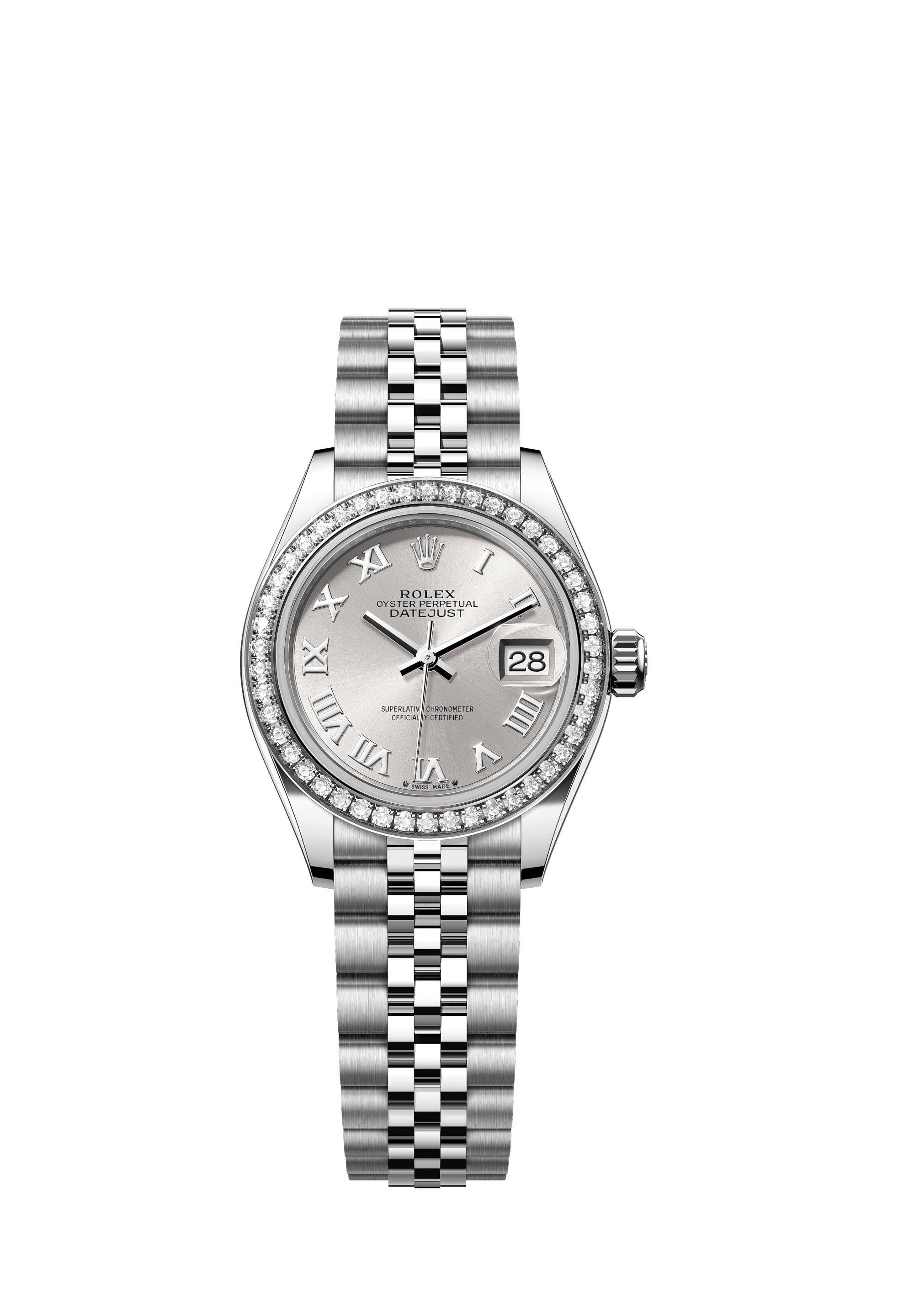 This Oyster Perpetual Lady-Datejust in Oystersteel and white gold features a silver dial and a Jubilee bracelet.