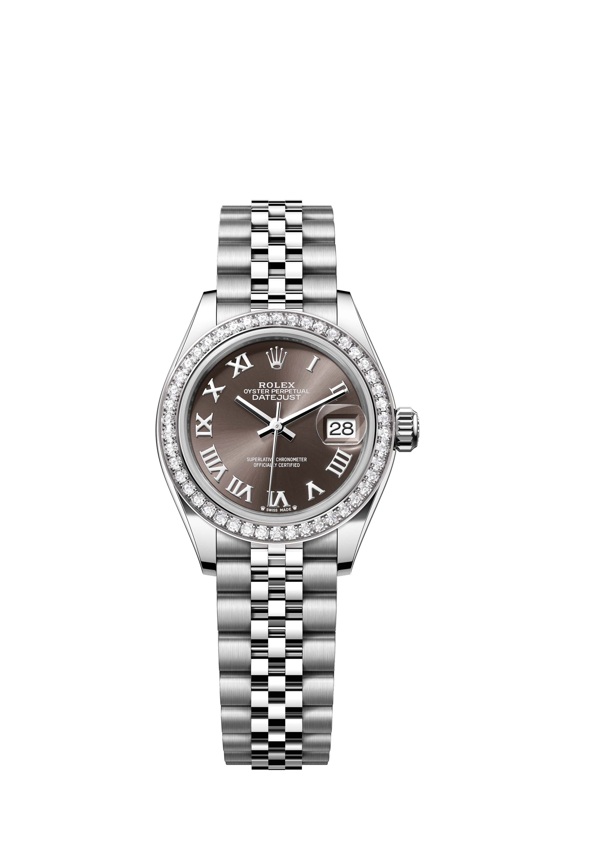 This Oyster Perpetual Lady-Datejust in Oystersteel and white gold features a dark grey dial and a Jubilee bracelet.