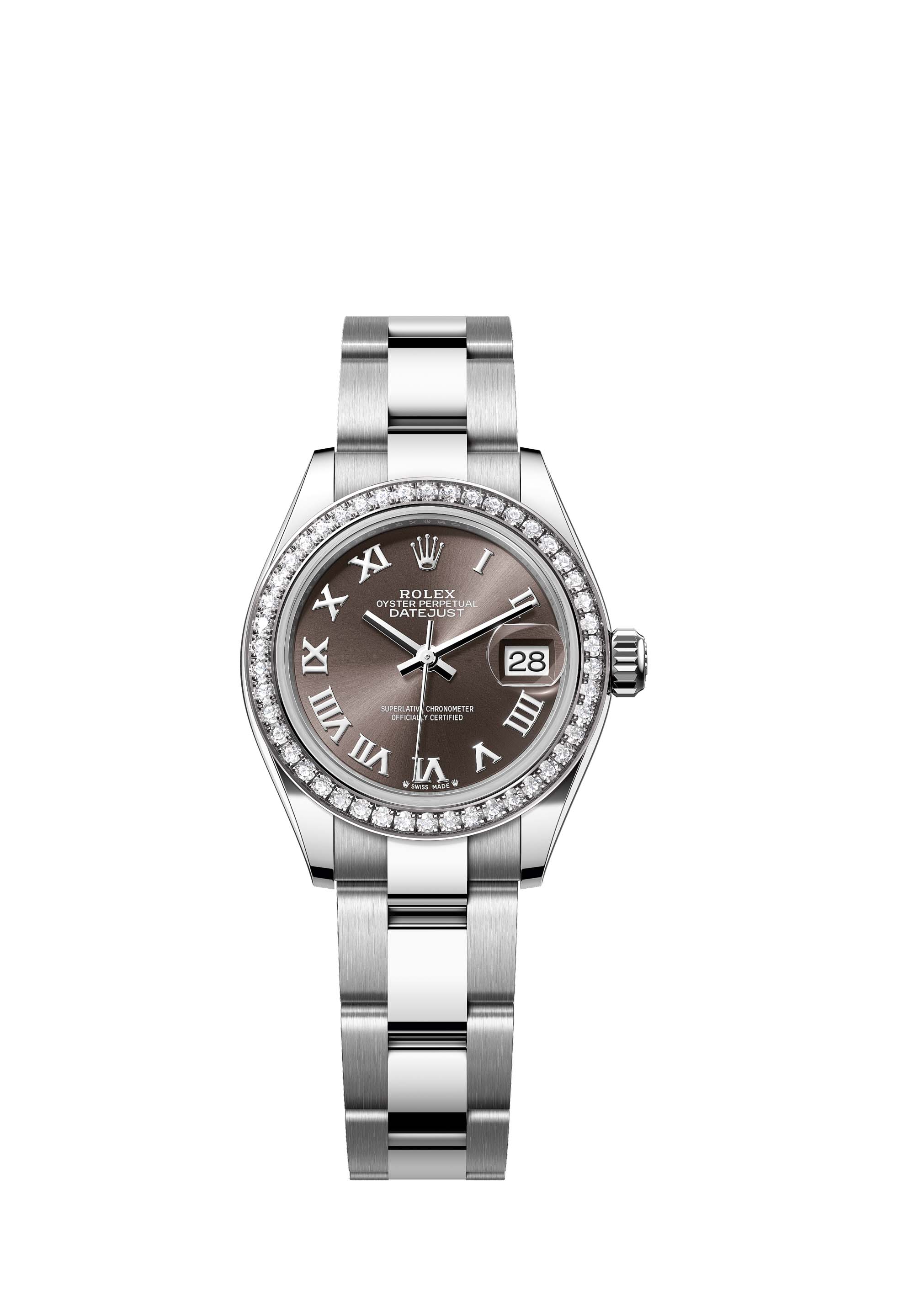 This Oyster Perpetual Lady-Datejust in Oystersteel and white gold features a dark grey dial and an Oyster bracelet.