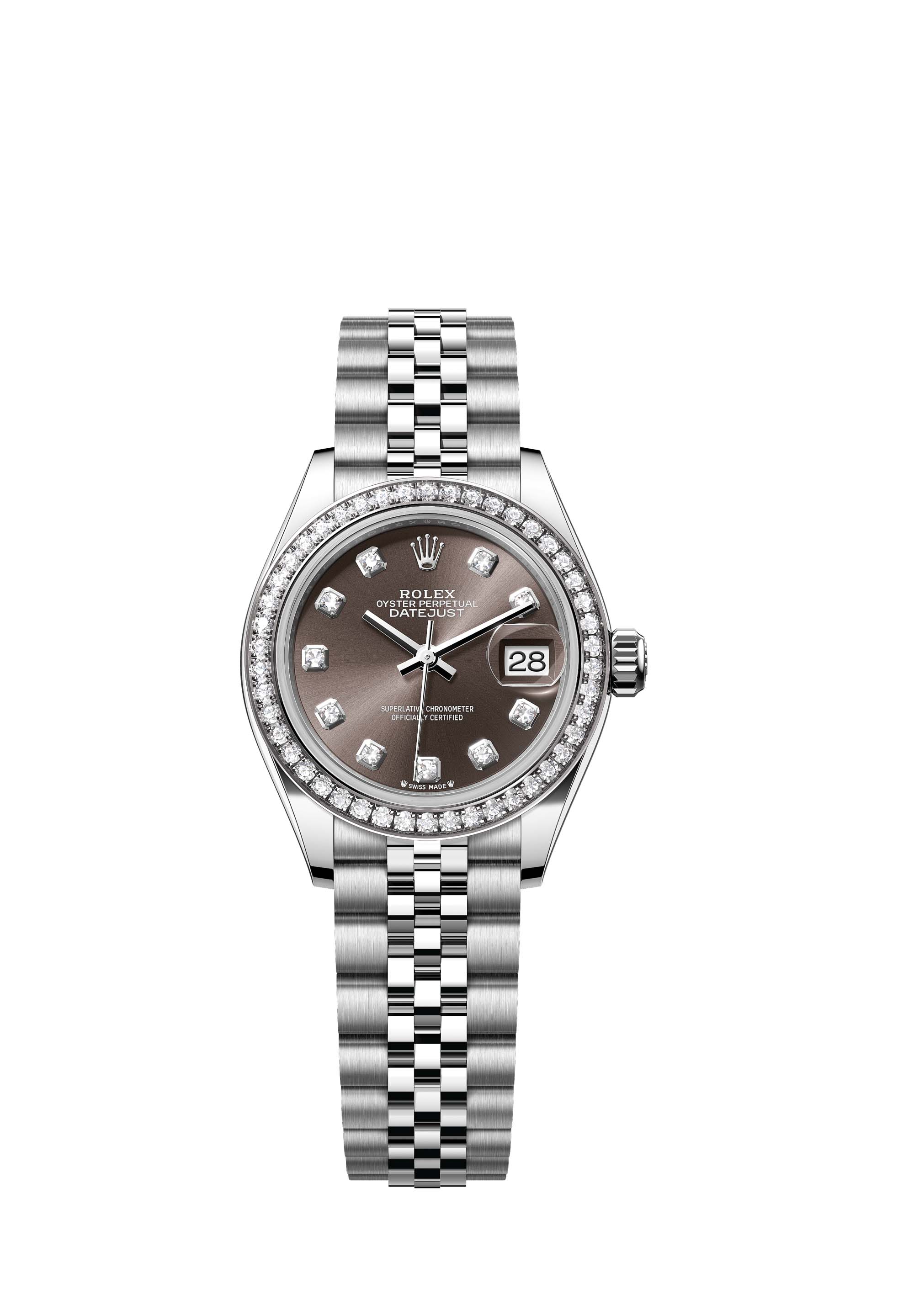 This Oyster Perpetual Lady-Datejust in Oystersteel and white gold features a dark grey, diamond-set dial and a Jubilee bracelet.
