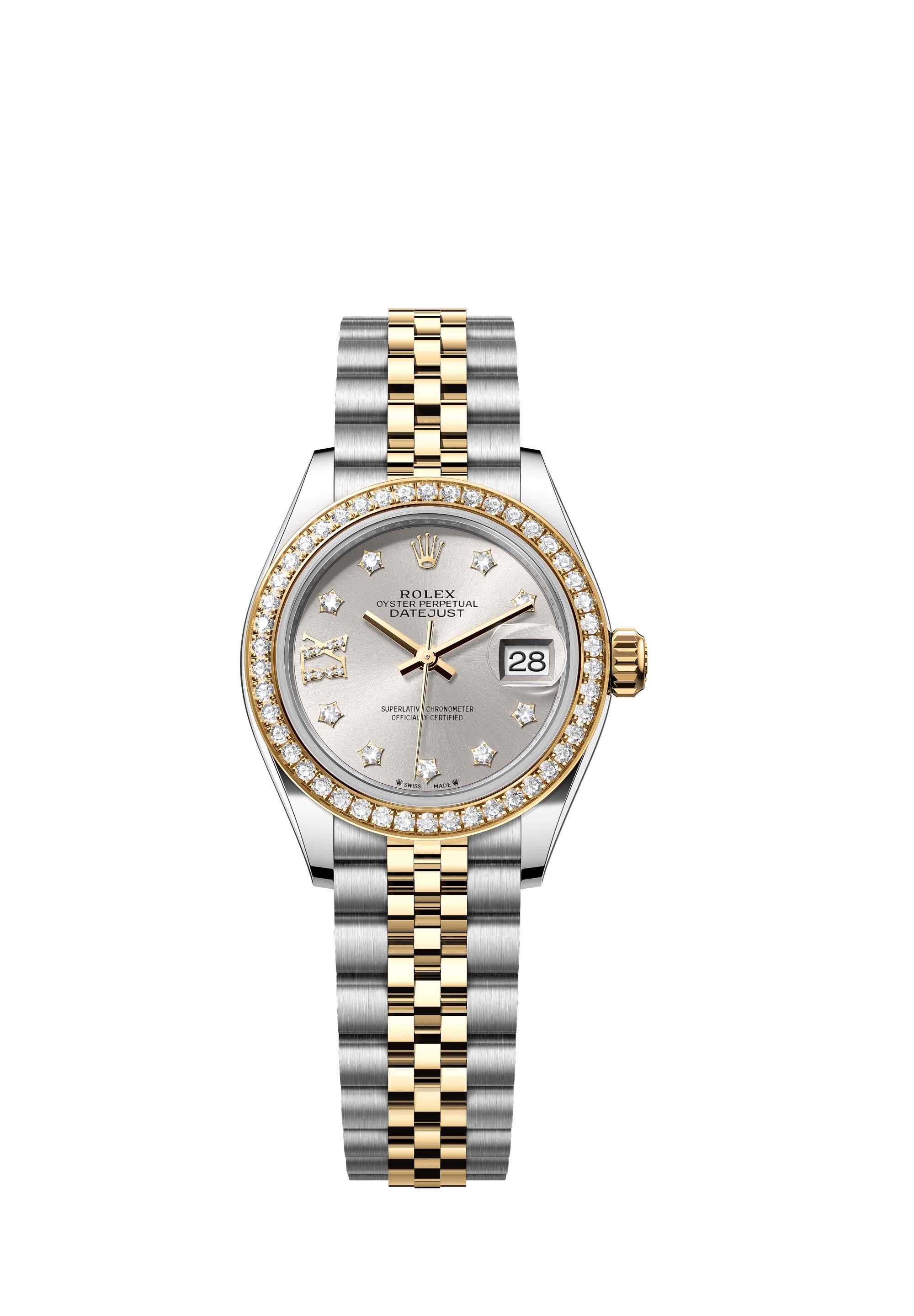 This Oyster Perpetual Lady-Datejust in Oystersteel and yellow gold features a silver, diamond-set dial and a Jubilee bracelet.