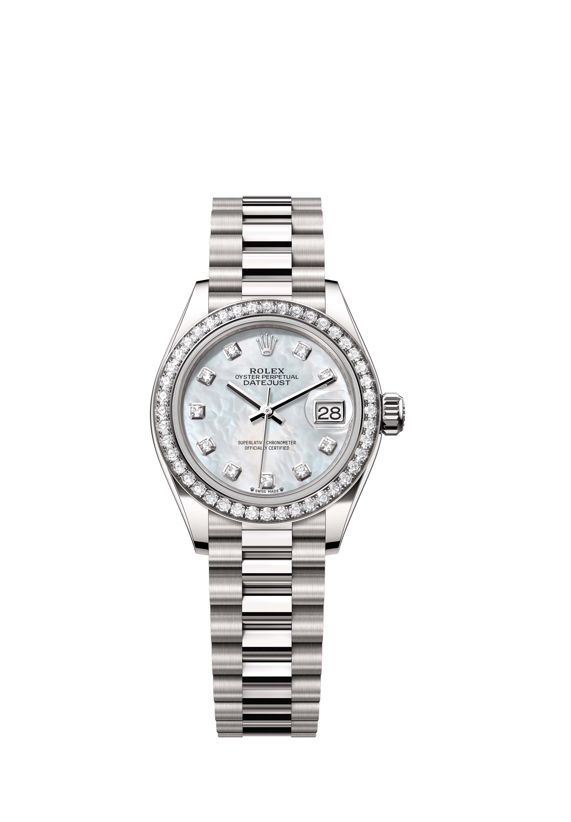 - Case : Oyster, 28 mm, white gold and diamonds