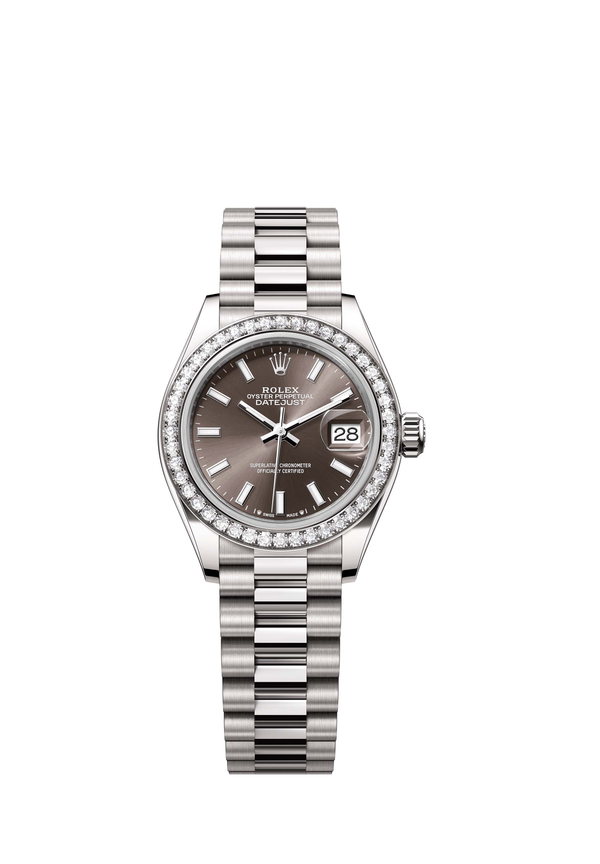 This Oyster Perpetual Lady-Datejust in 18 ct white gold features a dark grey dial and a President bracelet.