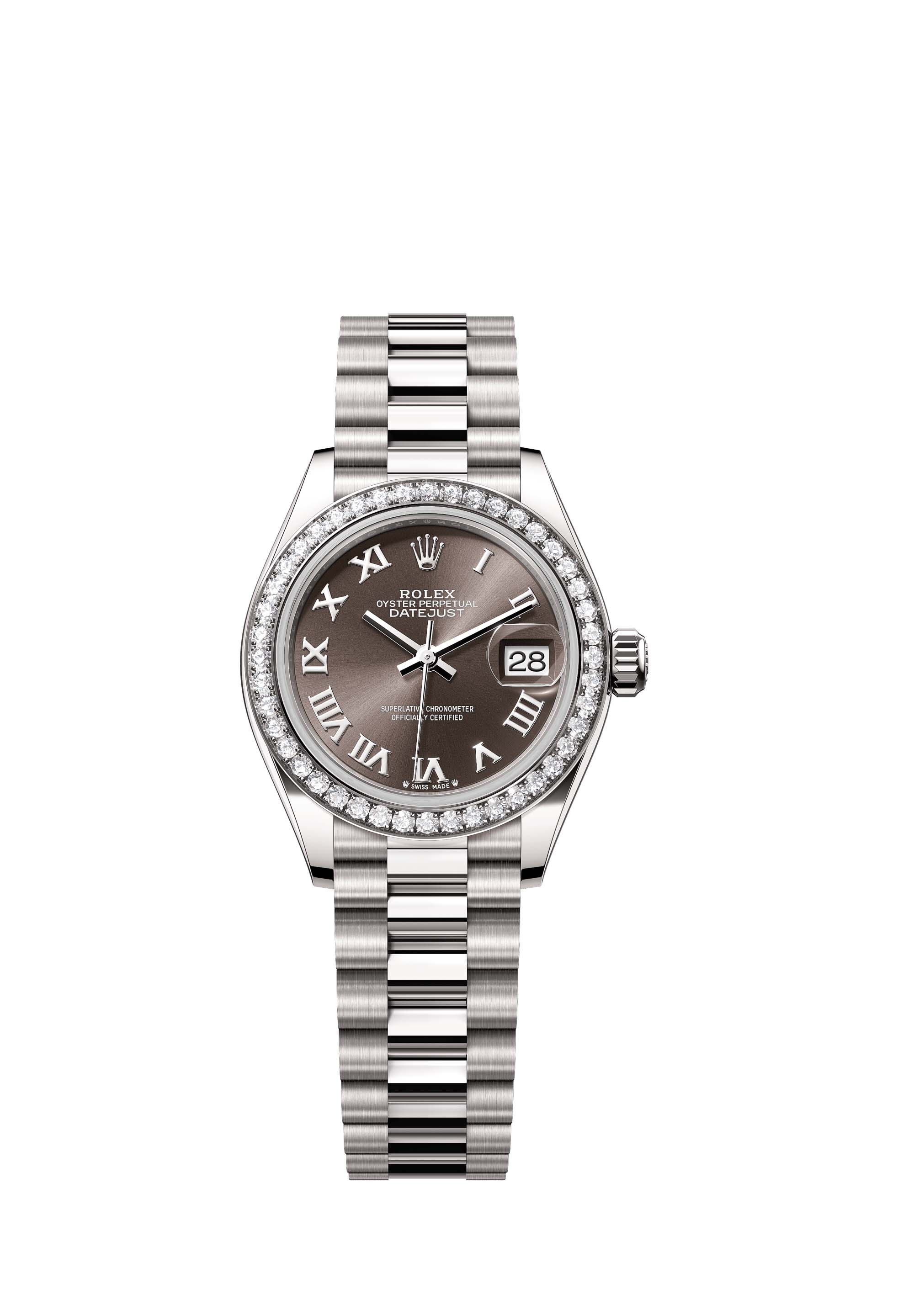 - Case : Oyster, 28 mm, white gold and diamonds