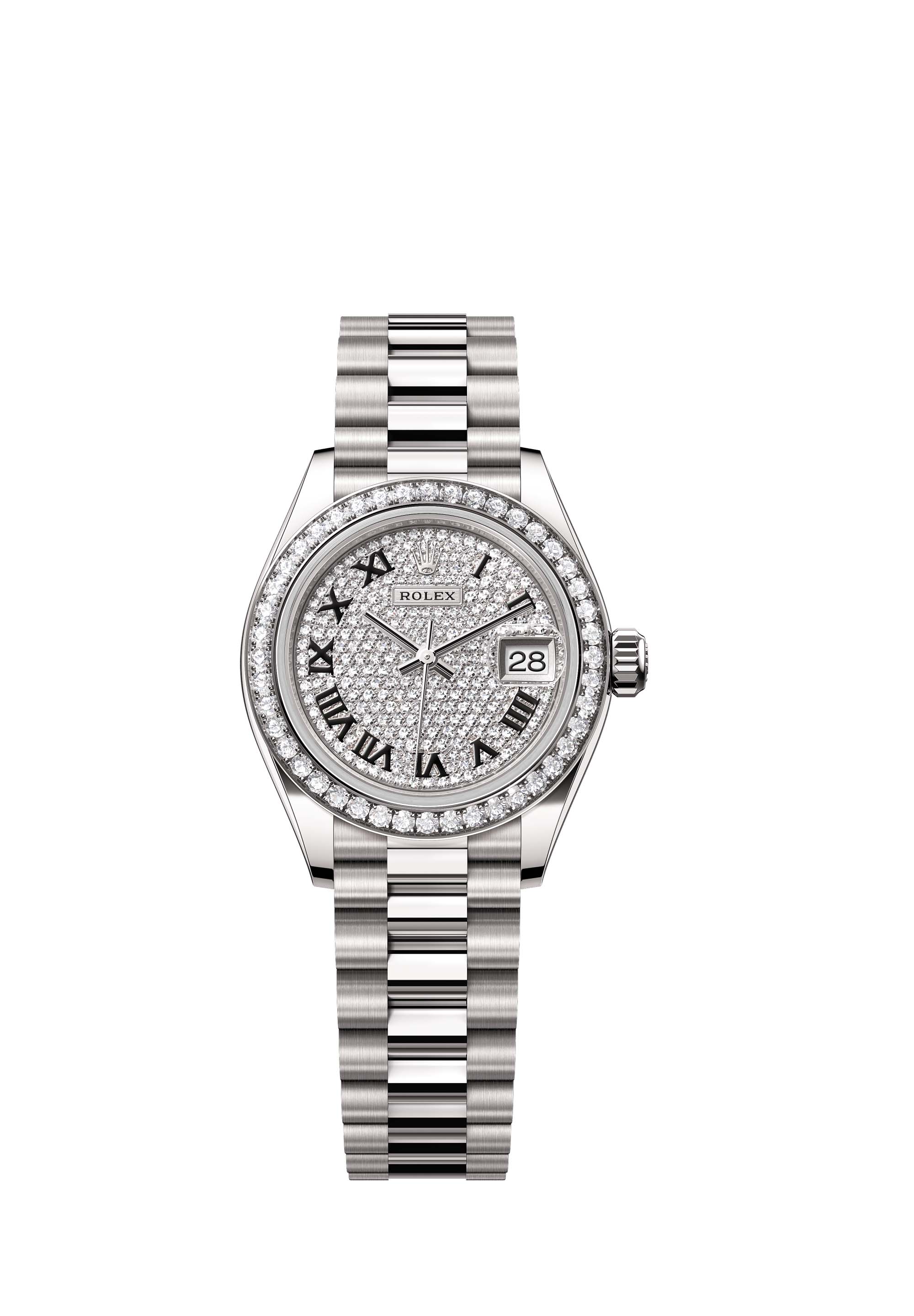 This Oyster Perpetual Lady-Datejust in 18 ct white gold features a diamond-paved dial and a President bracelet.