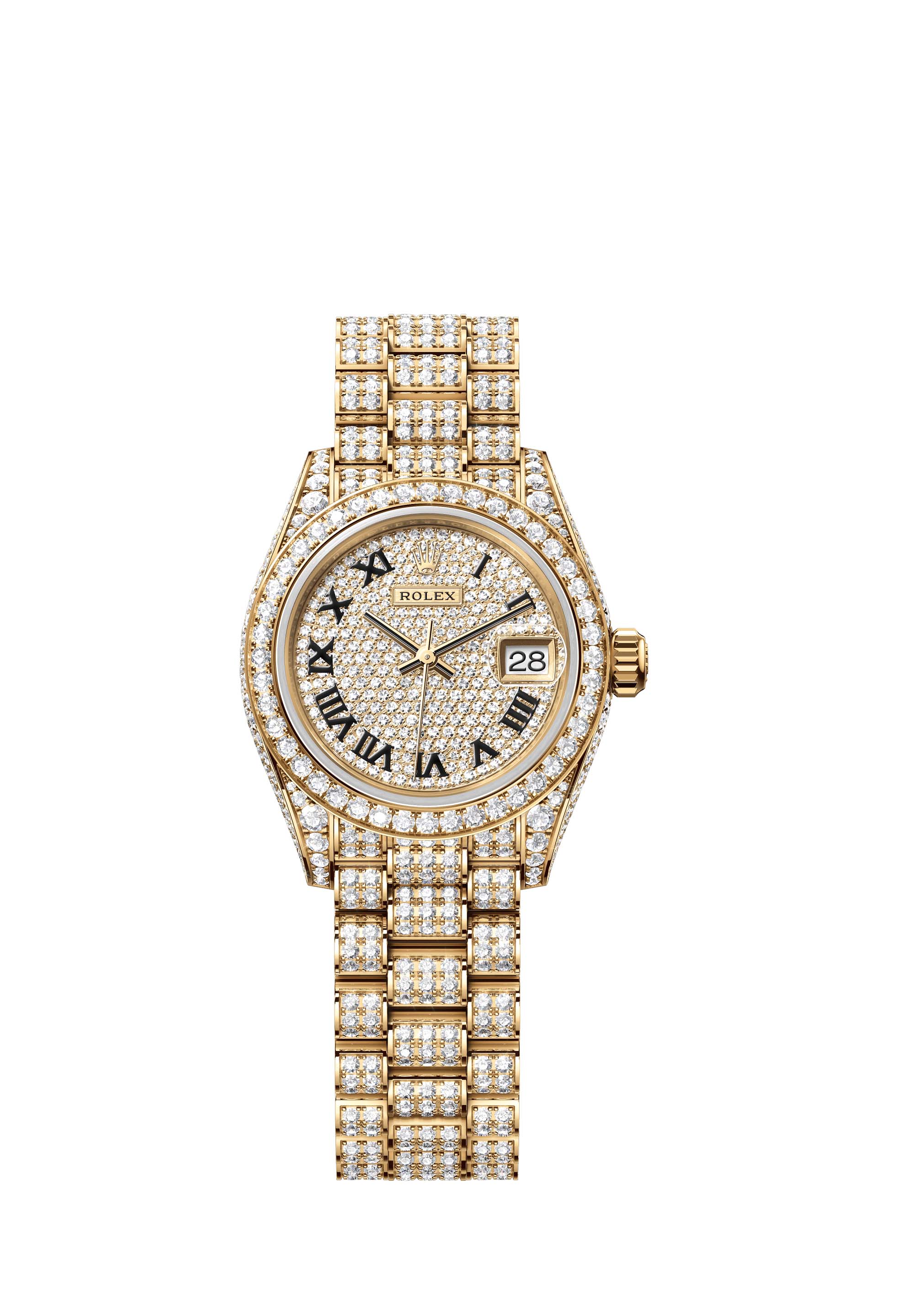 This Oyster Perpetual Lady-Datejust in 18 ct yellow gold features a diamond-paved dial and a diamond-set President bracelet.