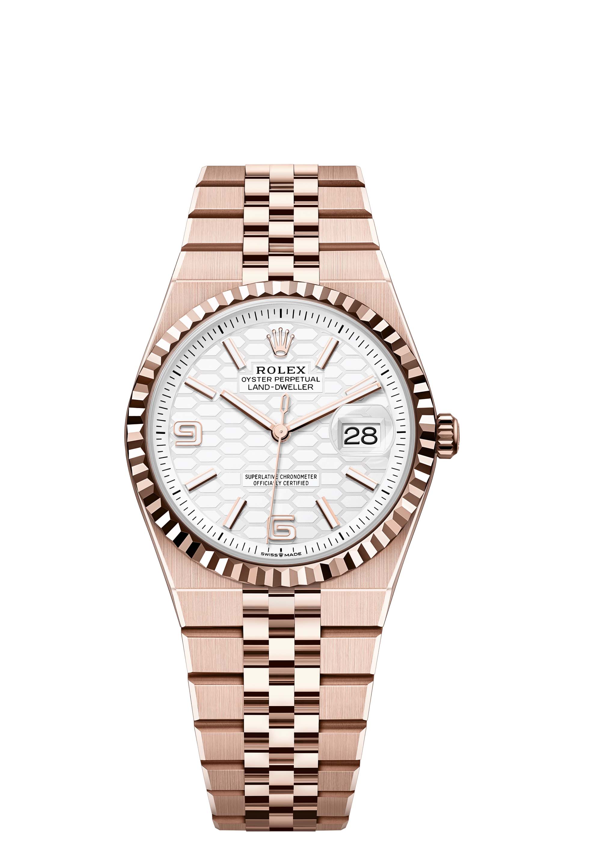 The Land-Dweller 36 in 18 ct Everose gold with an intense white, honeycomb-motif dial and Flat Jubilee bracelet.