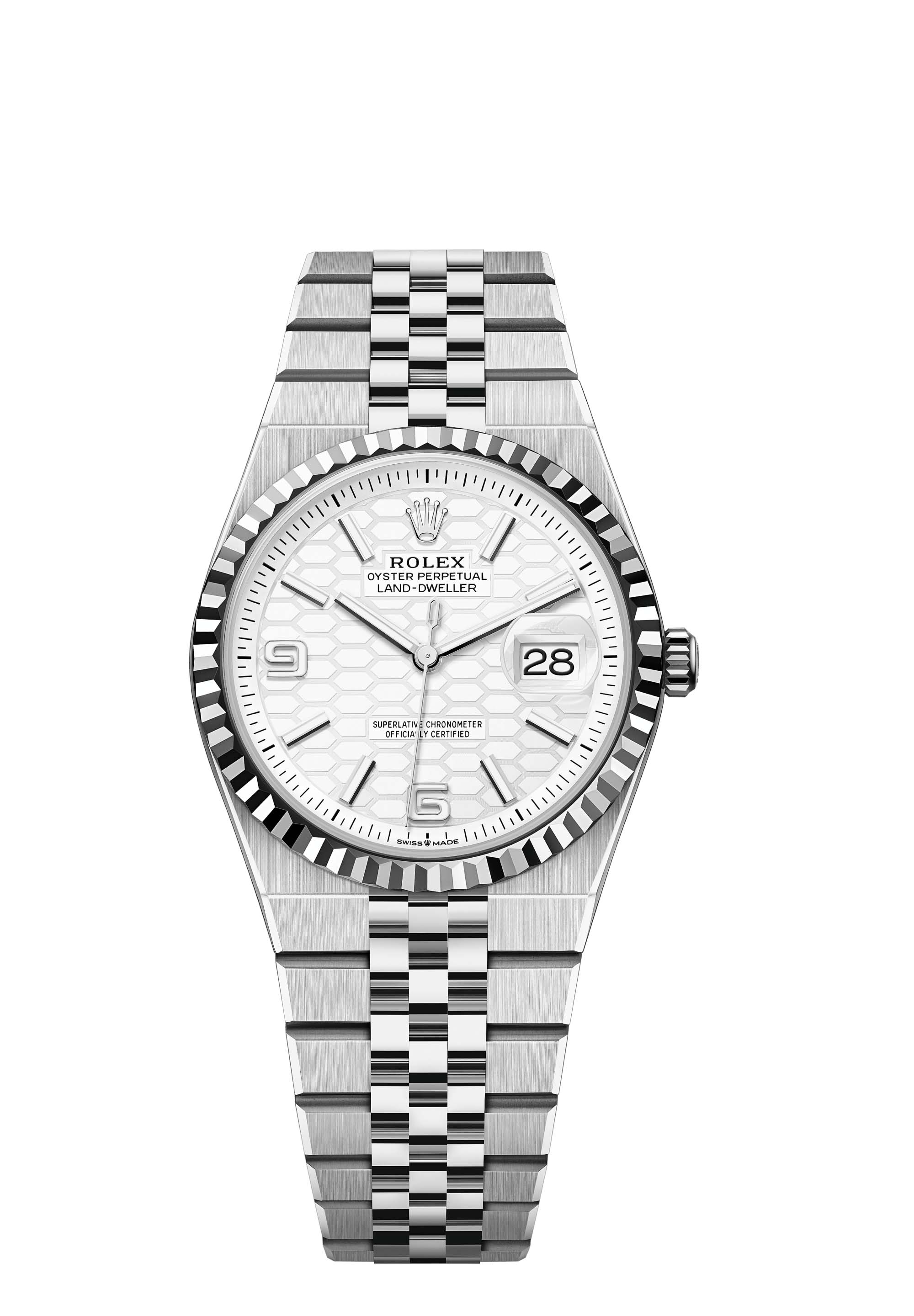 The Land-Dweller 36 in Oystersteel and white gold with an intense white, honeycomb-motif dial and Flat Jubilee bracelet.