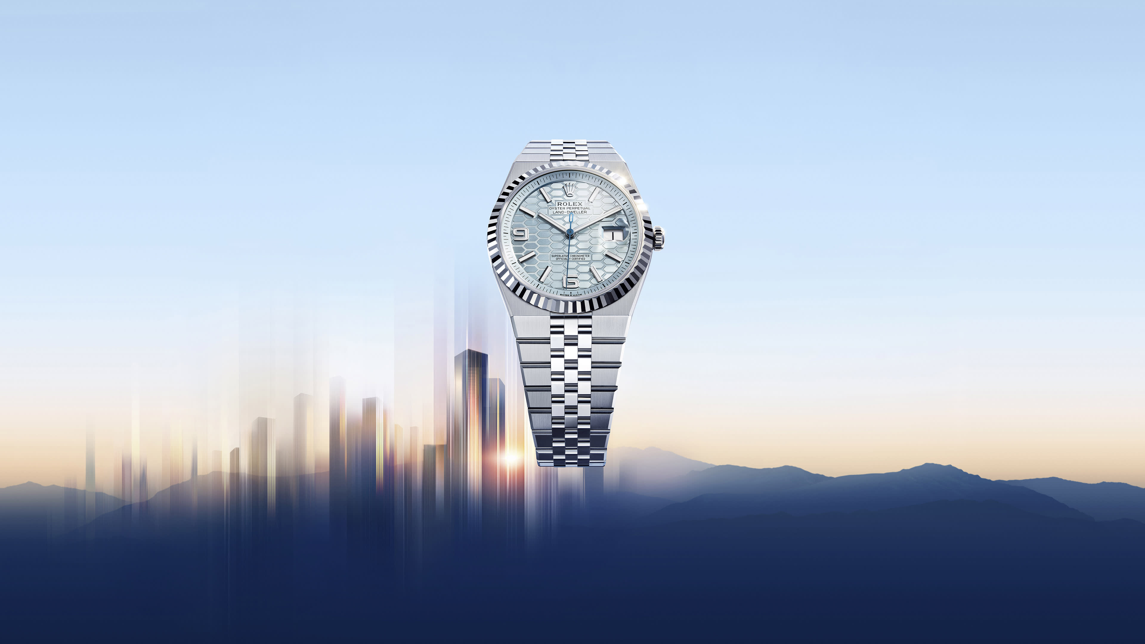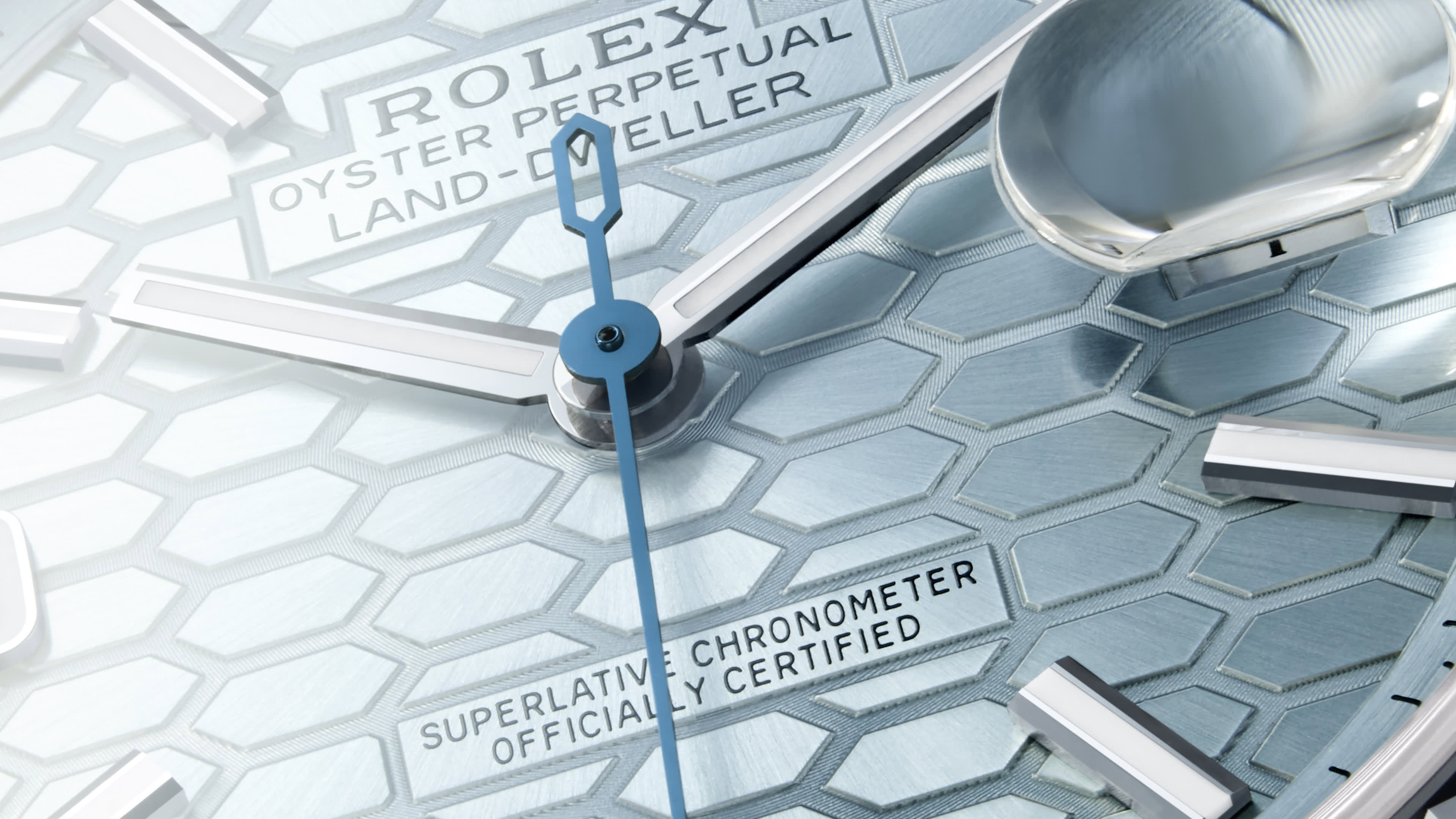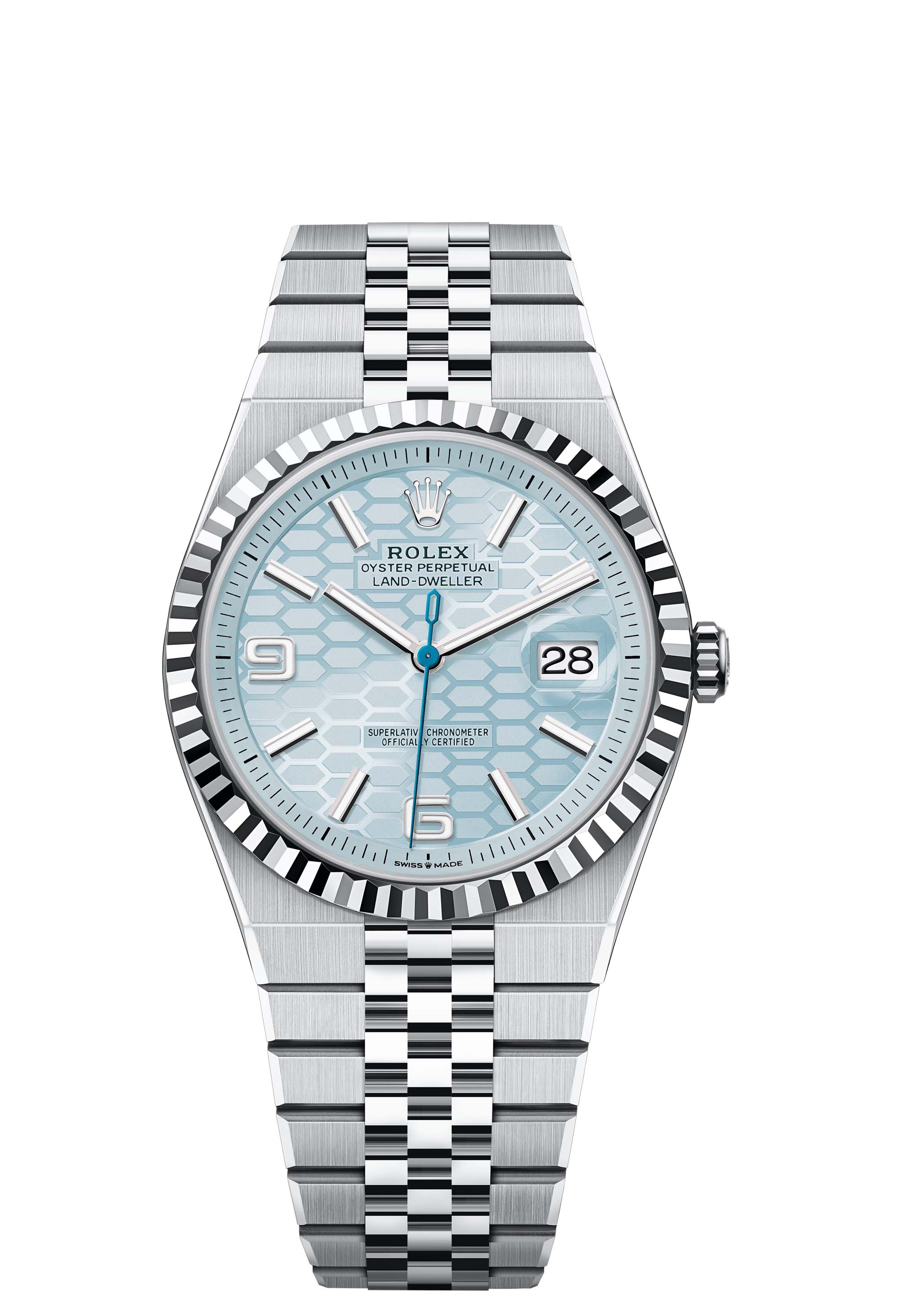 The Land-Dweller 40 in platinum with an ice-blue, honeycomb-motif dial and Flat Jubilee bracelet.