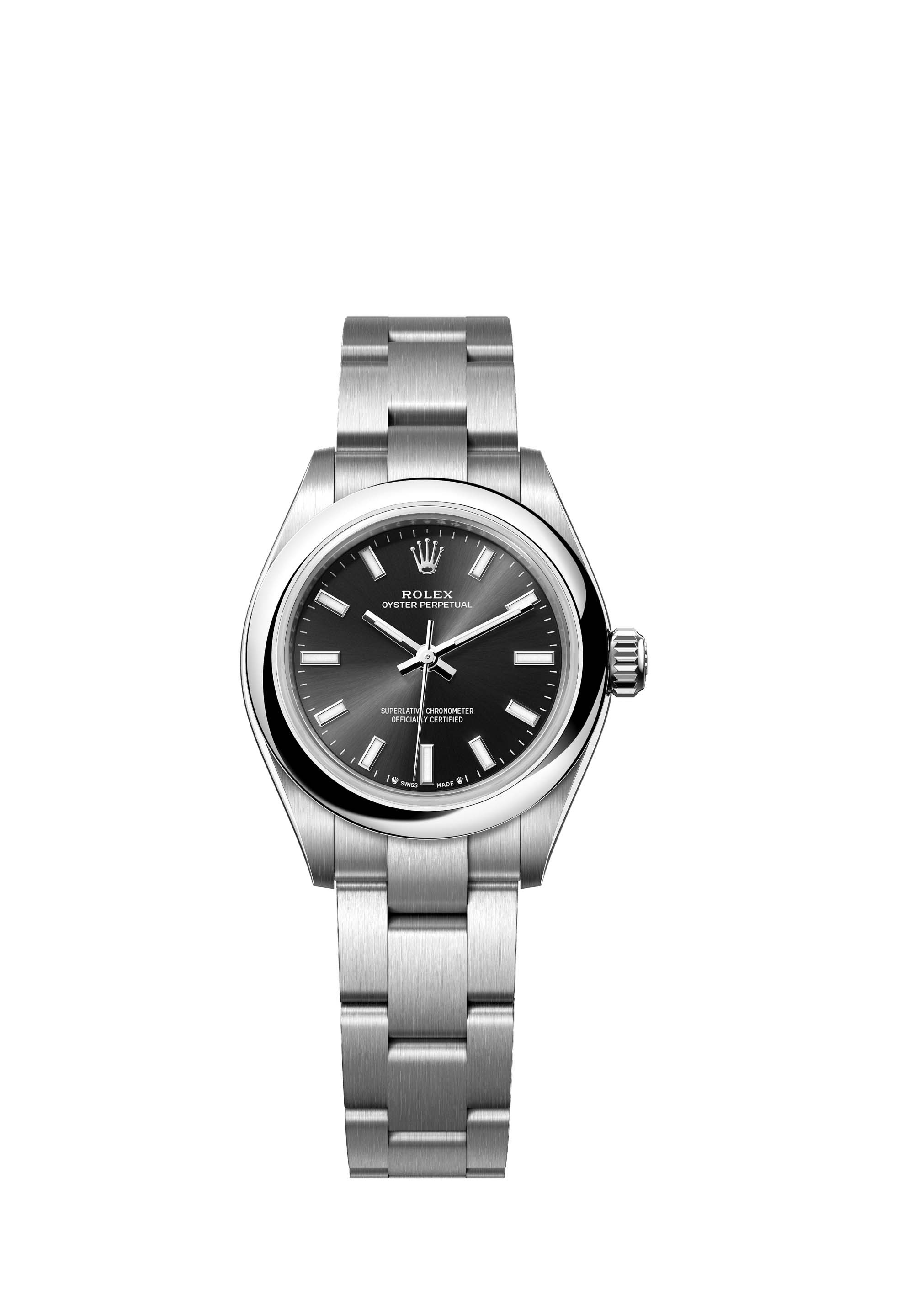 The Oyster Perpetual 28 with a bright black dial and an Oyster bracelet.