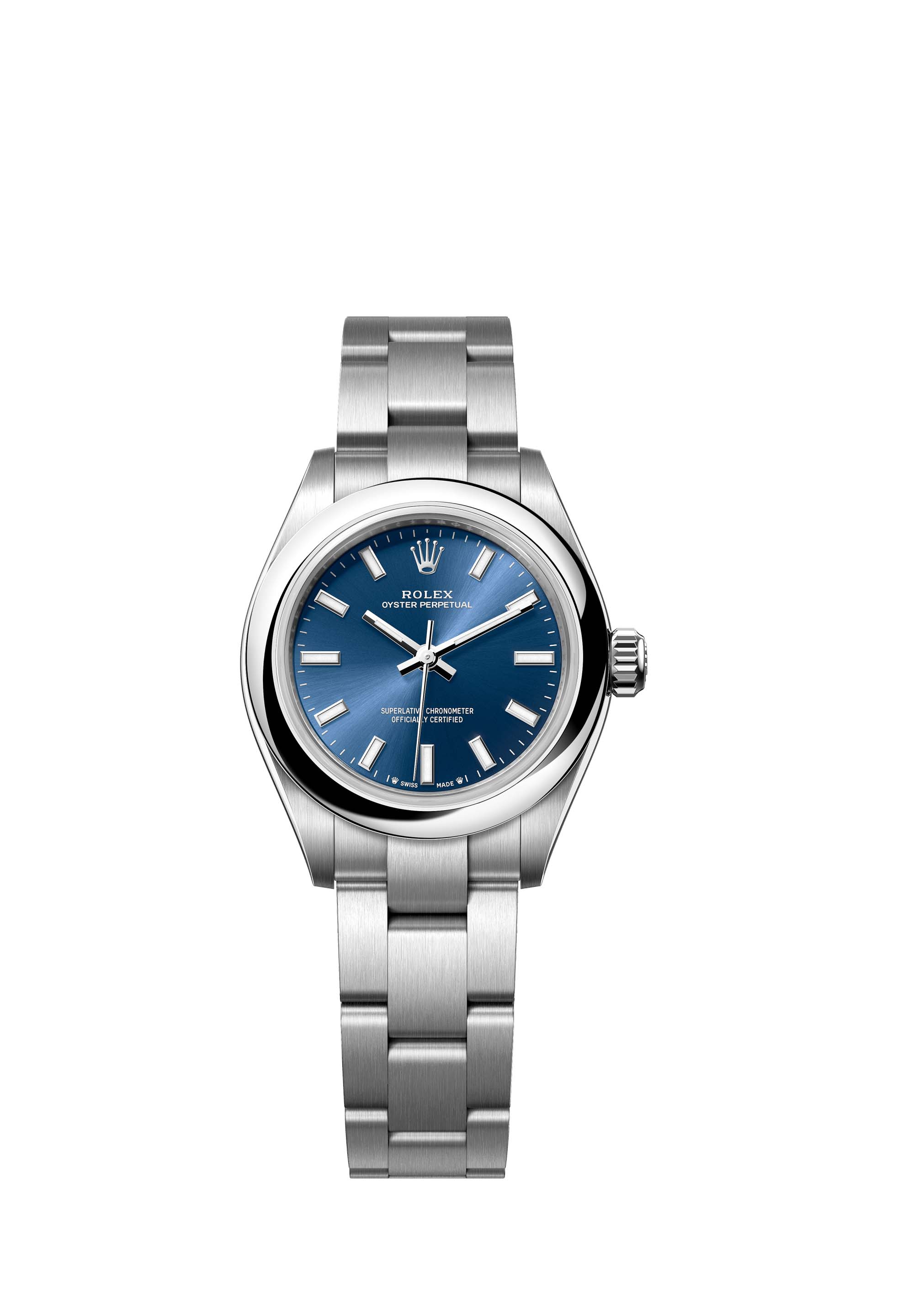 The Oyster Perpetual 28 with a bright blue dial and an Oyster bracelet.