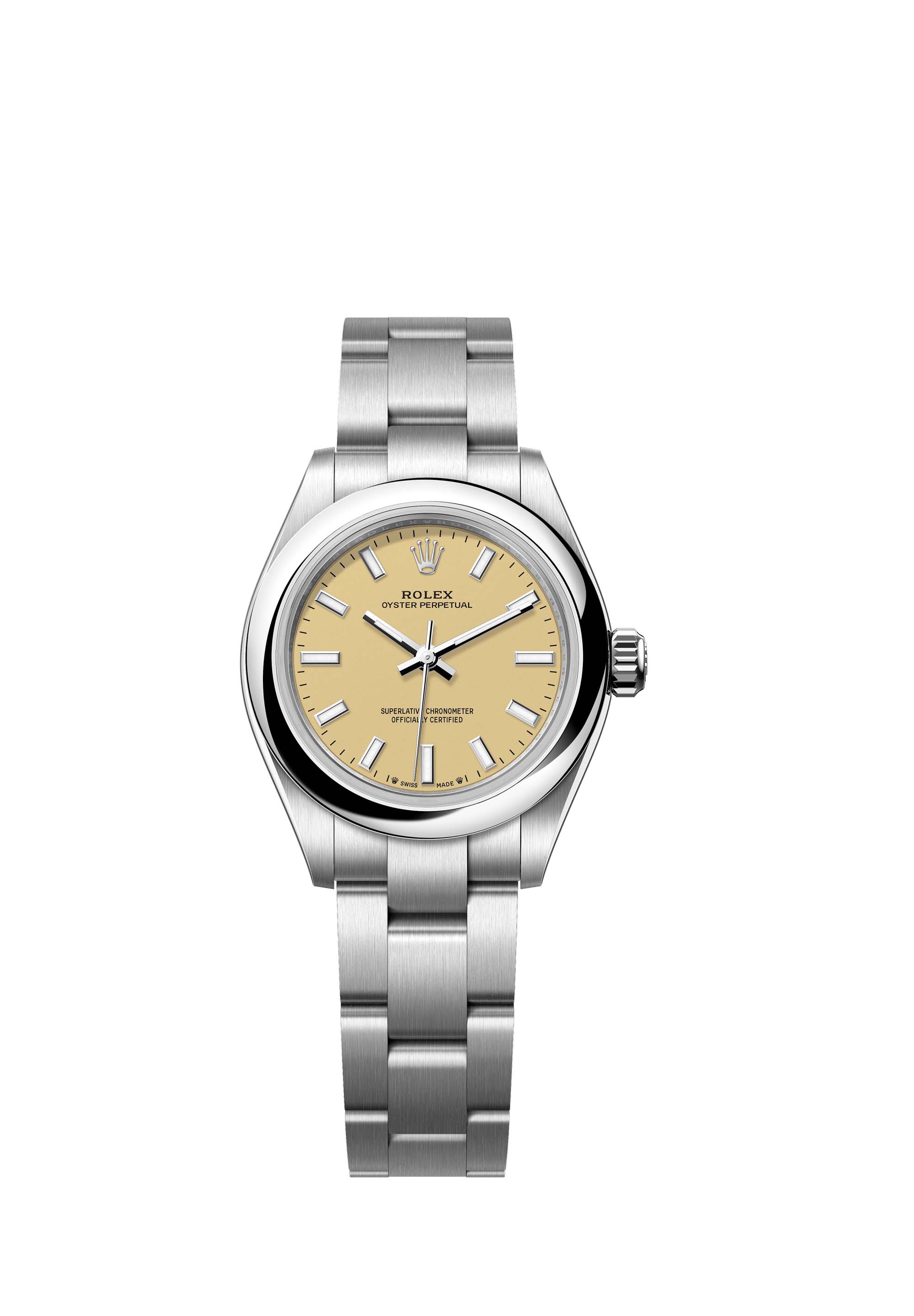The Oyster Perpetual 28 with a beige dial and an Oyster bracelet.