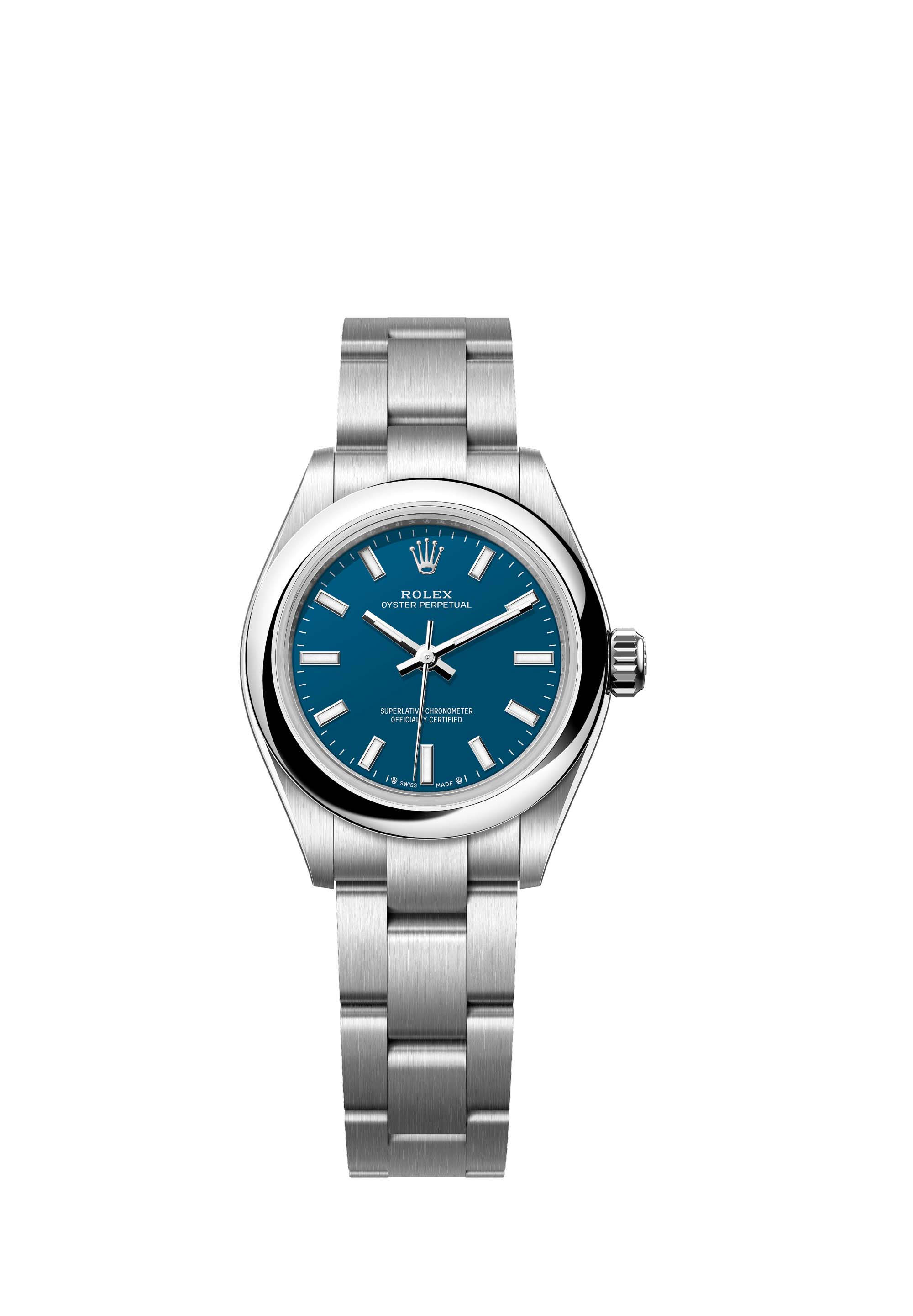 The Oyster Perpetual 28 with a med blue dial and an Oyster bracelet.