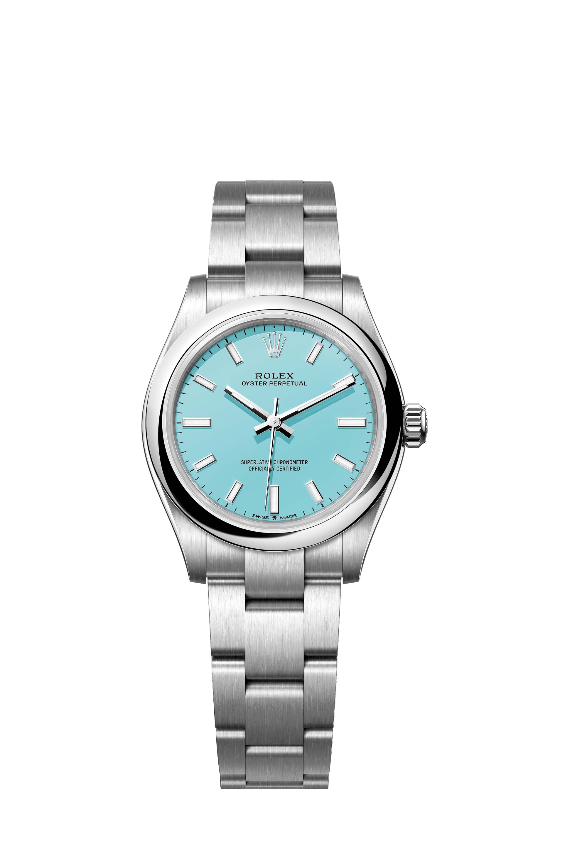 The Oyster Perpetual 31 with a turquoise blue dial and an Oyster bracelet.
