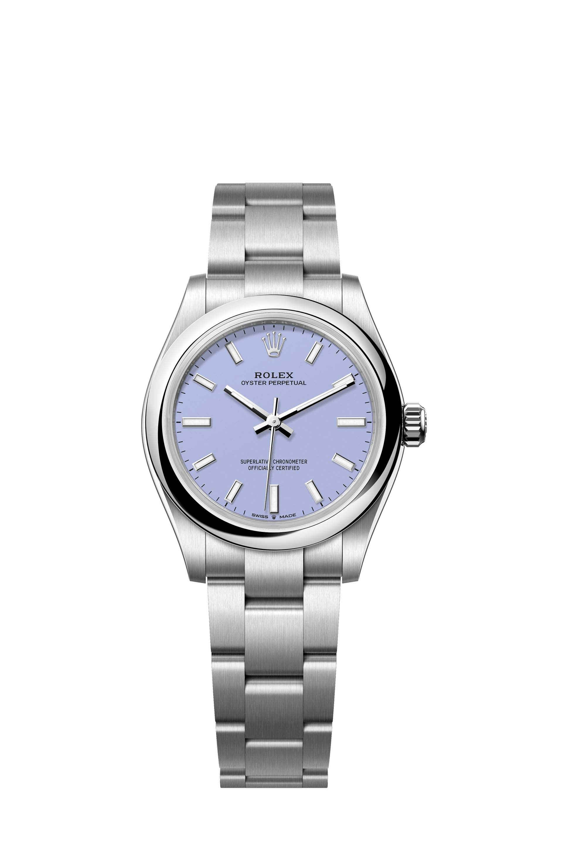 The Oyster Perpetual 31 with a lavender dial and an Oyster bracelet.