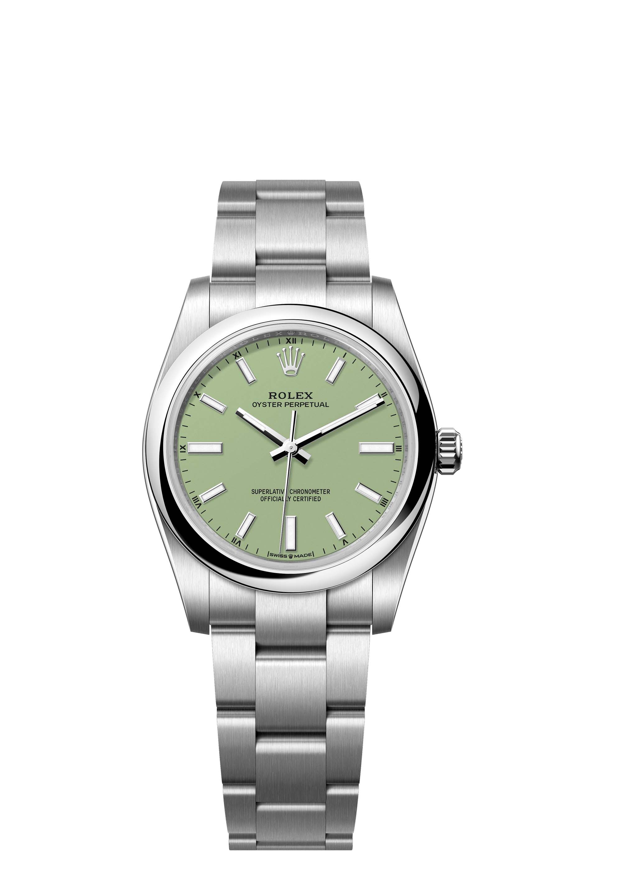 The Oyster Perpetual 34 with a pistachio dial and an Oyster bracelet.