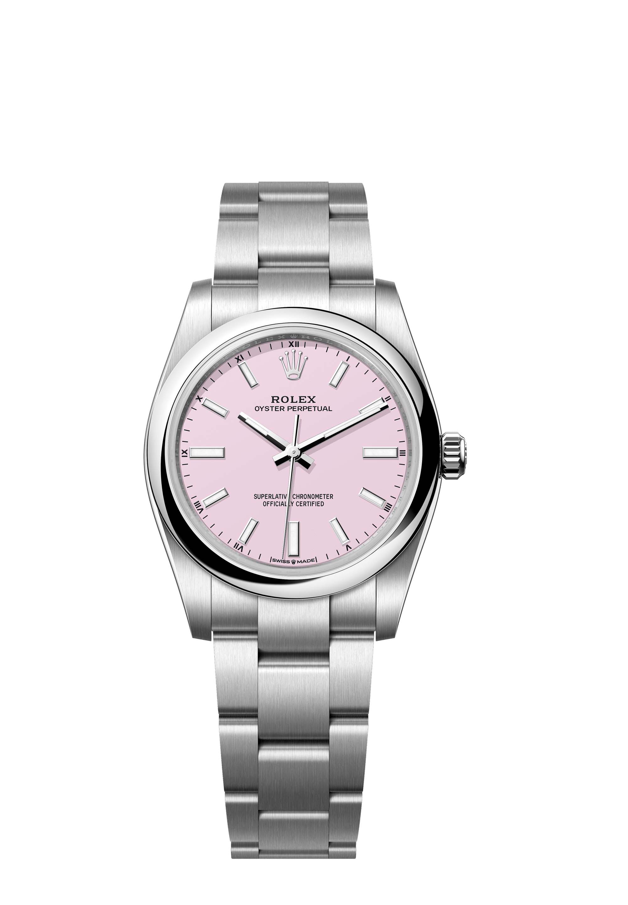 The Oyster Perpetual 34 with a candy pink dial and an Oyster bracelet.