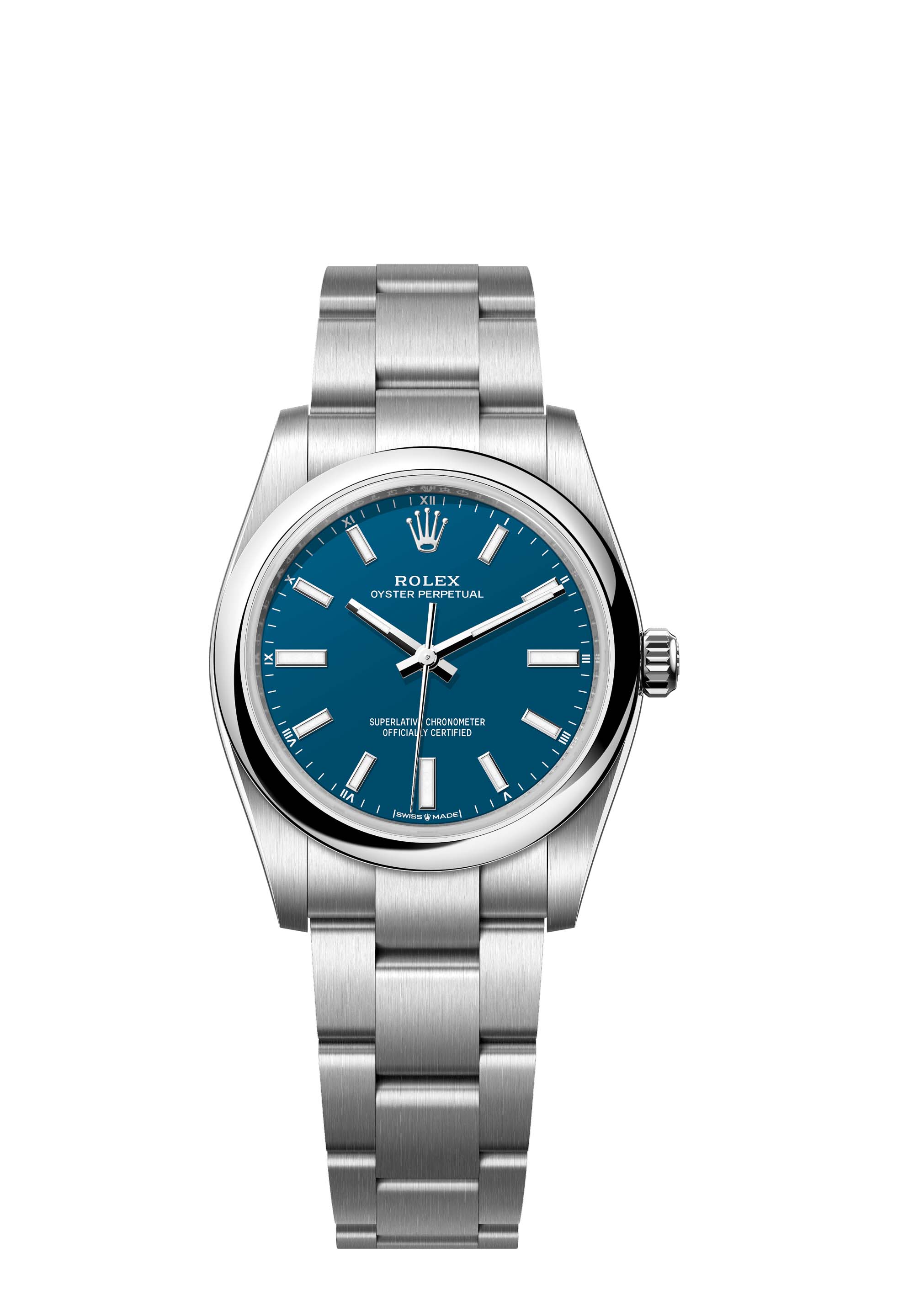 The Oyster Perpetual 34 with a med blue dial and an Oyster bracelet.