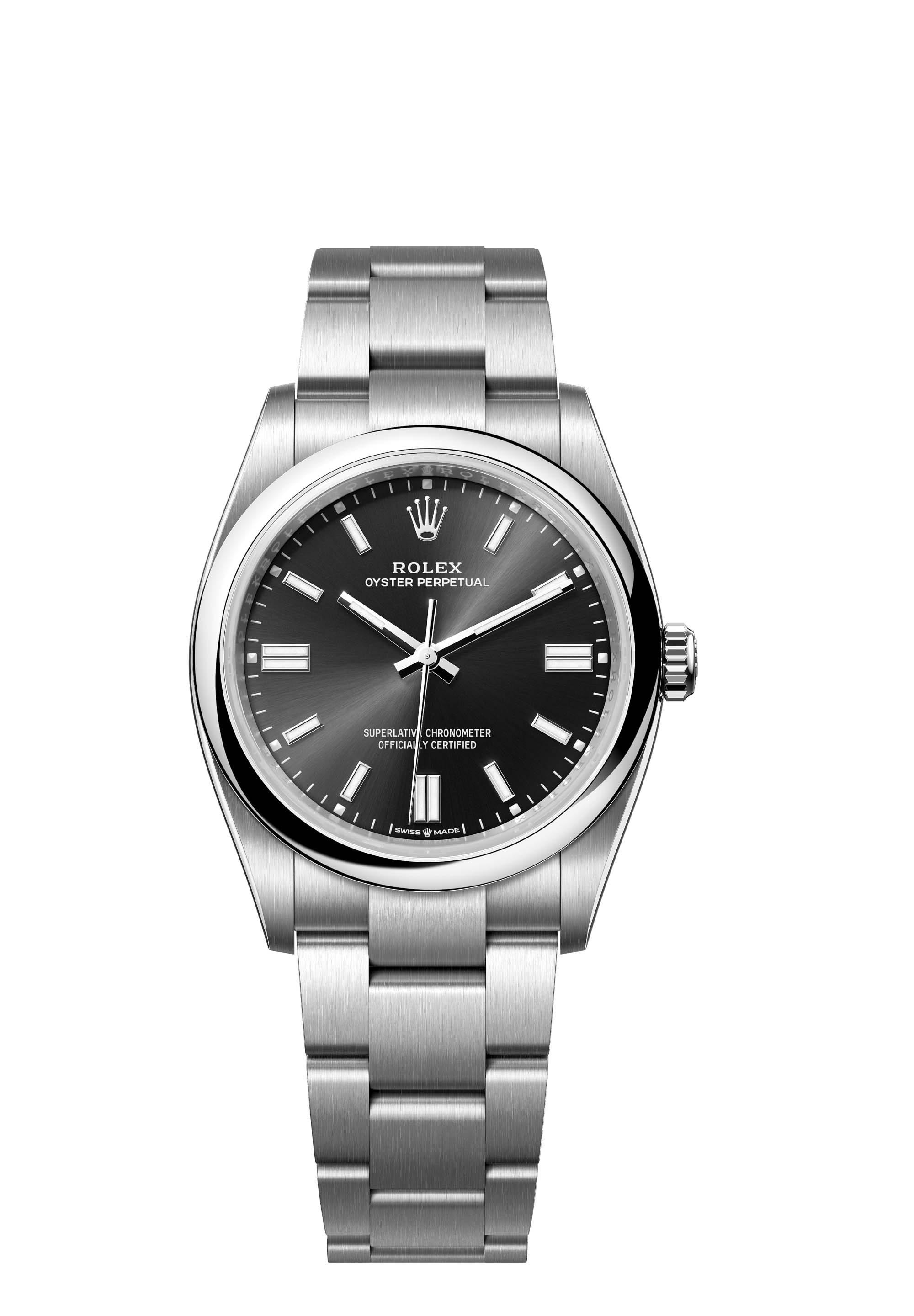 The Oyster Perpetual 36 with a bright black dial and an Oyster bracelet.