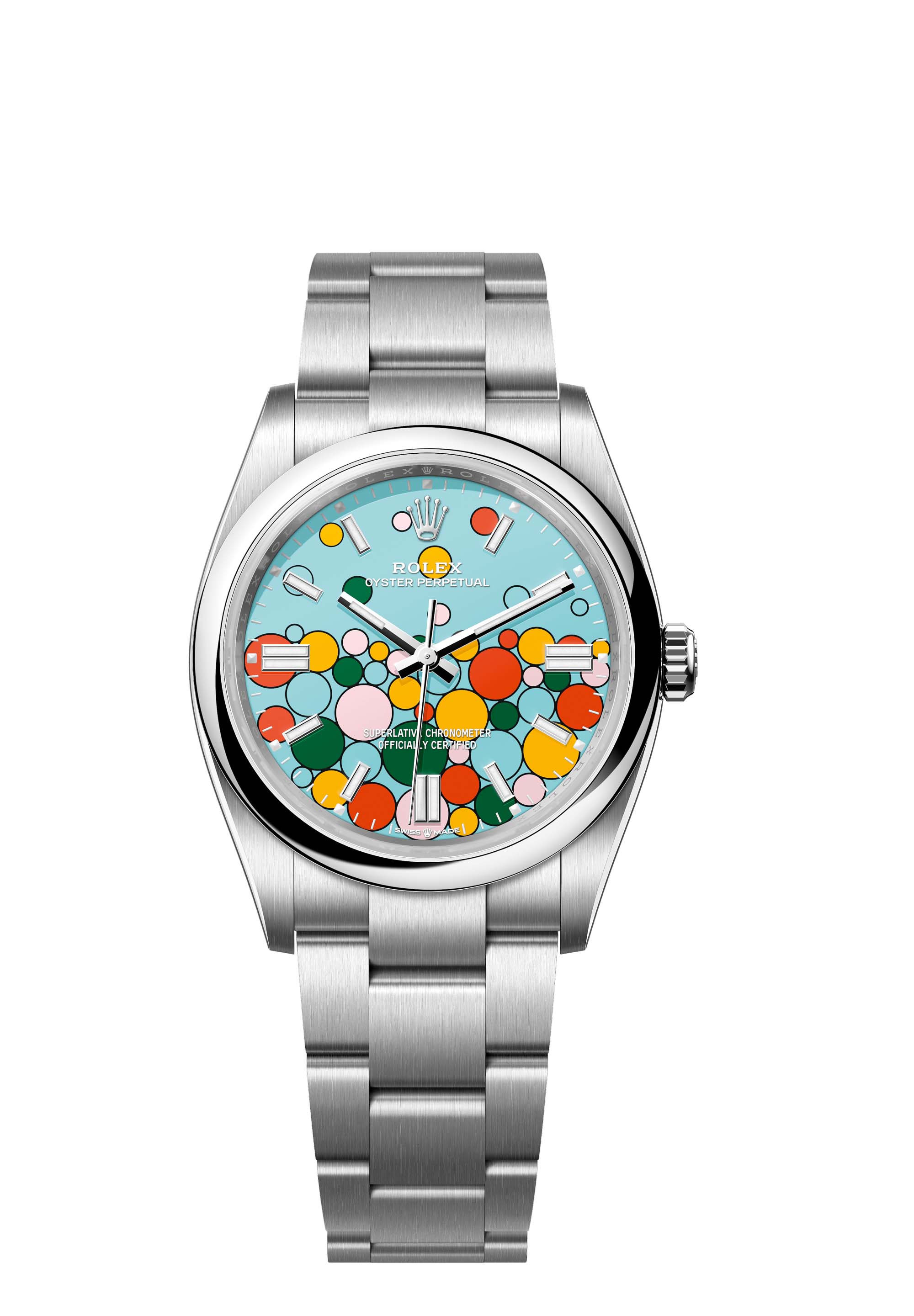 The Oyster Perpetual 36 with a turquoise blue, Celebration-motif dial and an Oyster bracelet.