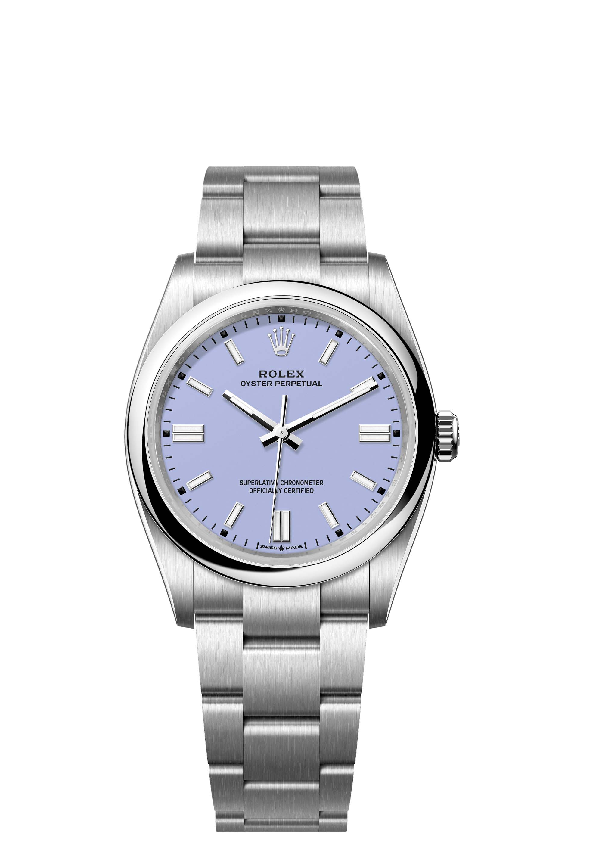 The Oyster Perpetual 36 with a lavender dial and an Oyster bracelet.