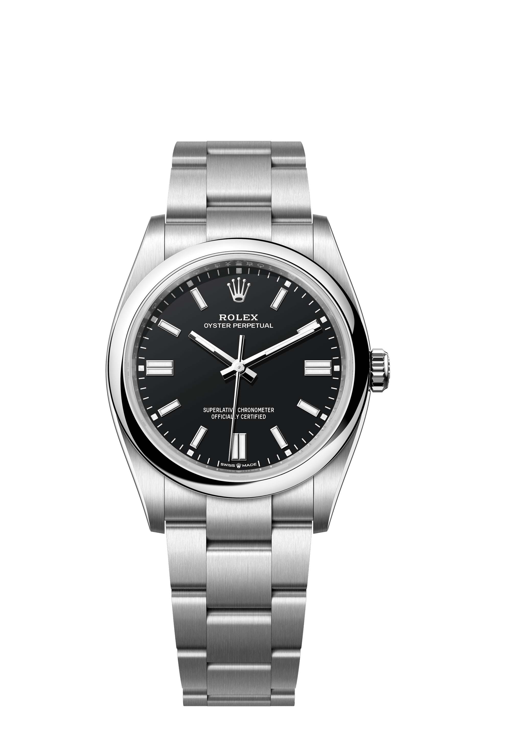 The Oyster Perpetual 36 with a black dial and an Oyster bracelet.