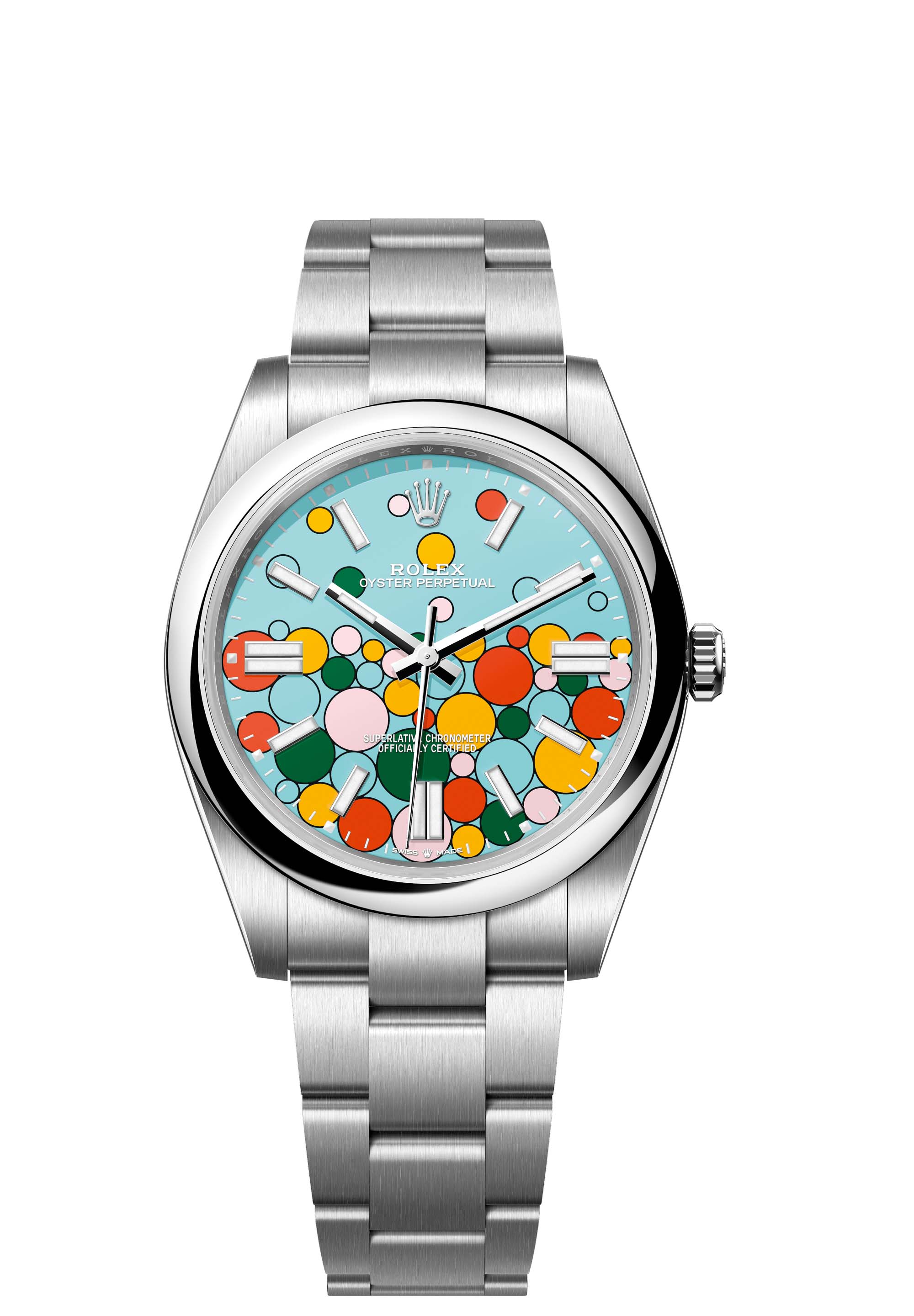 Named ‘Celebration’, this brand-new motif is available for the Oyster Perpetual 31, Oyster Perpetual 36 and Oyster Perpetual 41. Composed of differently sized bubbles fringed with black, it encapsulates the vivid colours of the lacquered dials introduced in 2020, bringing turquoise blue into play for the background colour, and candy pink, yellow, coral red and green for the bubbles.
