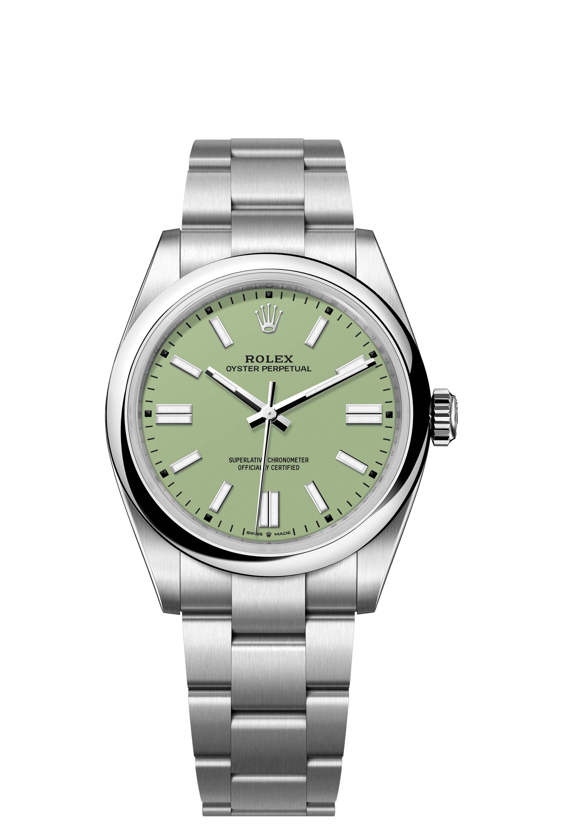 The Oyster Perpetual 41 with a pistachio dial and an Oyster bracelet.