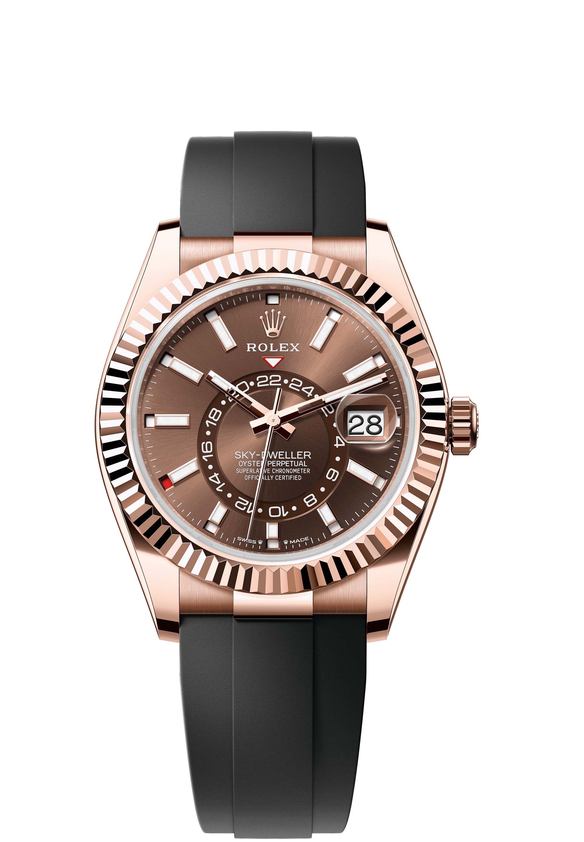 The Oyster Perpetual Sky-Dweller in 18 ct Everose gold with a chocolate dial and an Oysterflex bracelet.
