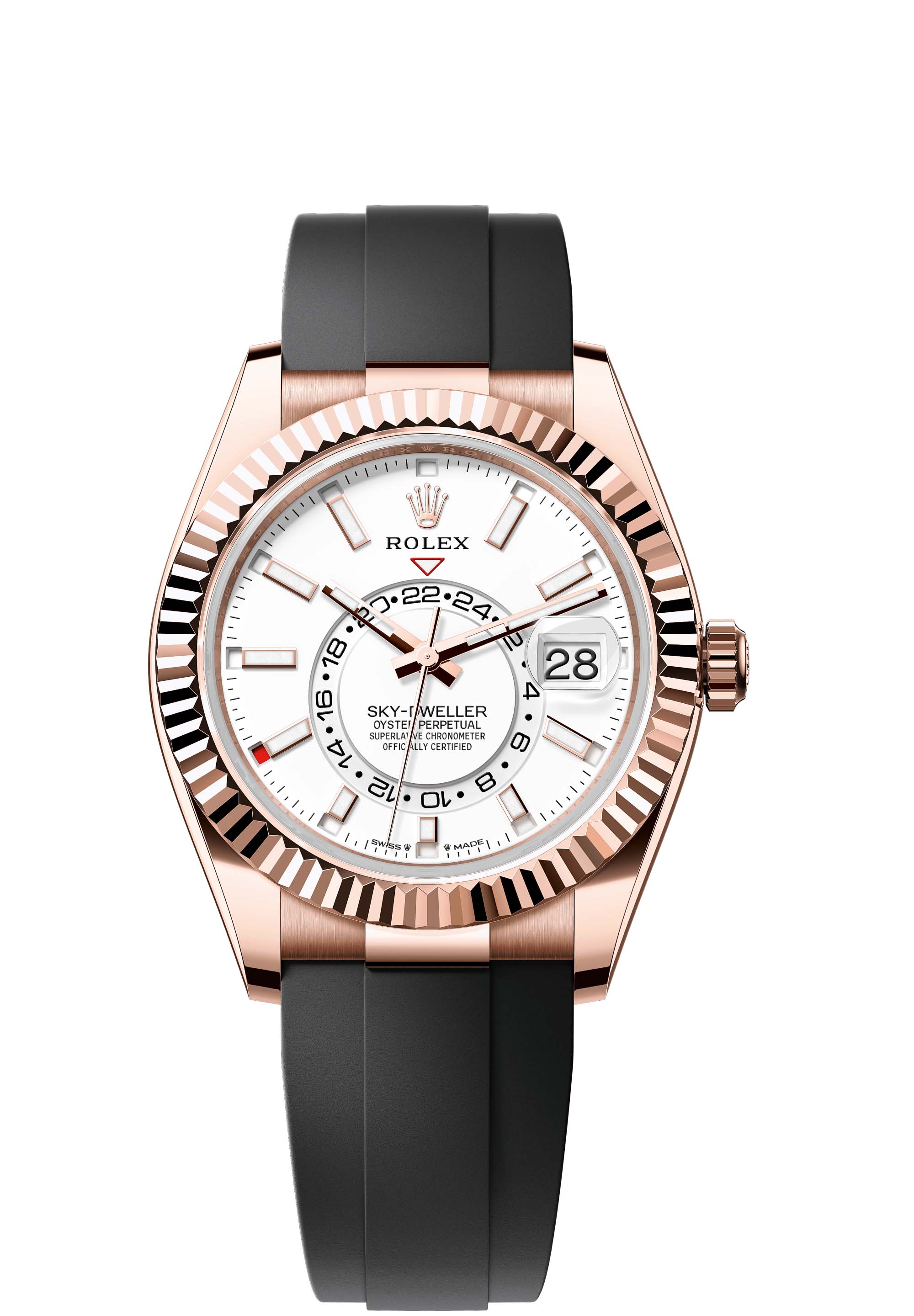 The Oyster Perpetual Sky-Dweller in 18 ct Everose gold with an intense white dial and an Oysterflex bracelet.