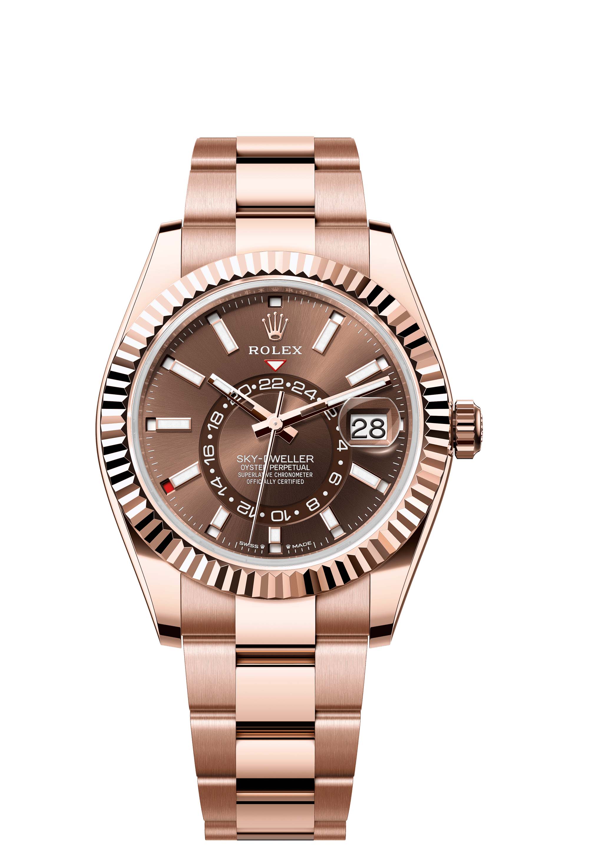 The Oyster Perpetual Sky-Dweller in 18 ct Everose gold with a chocolate dial and an Oyster bracelet.